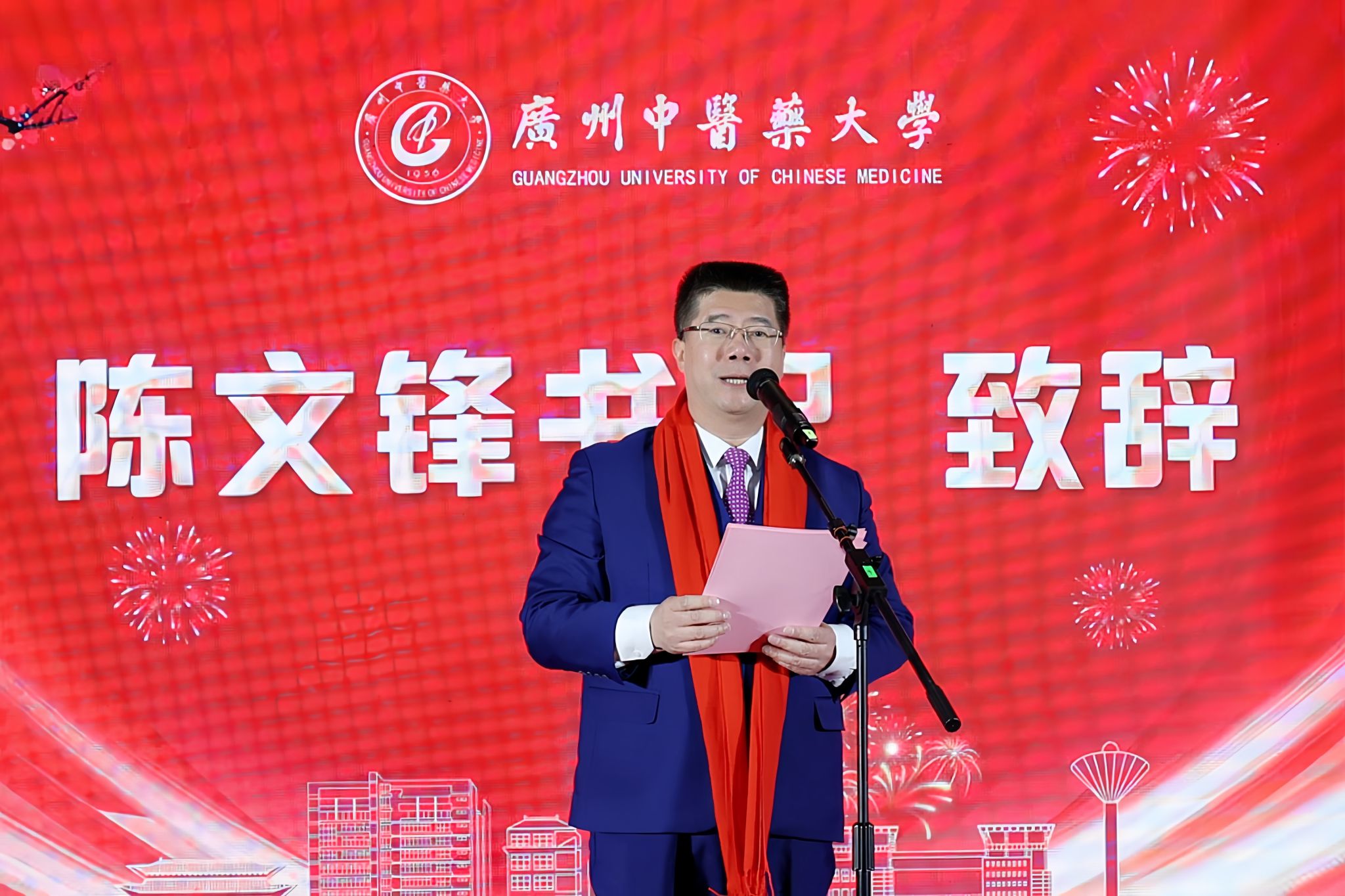 On January 26, Guangzhou University of Chinese Medicine held a New Year tea reception at the staff activity center at the university town campus. Leaders of the university, academicians, representatives from affiliated hospitals, representatives from university-local co-construction hospitals, leaders of university party andadministrationdepartments,leadersof secondary units, representatives of retired faculty and staff, representatives of democratic parties, teacher representatives, student representatives, and representativesoffront-lineworkersinservice departmentsgathered together to welcome the 2024 ChineseNew Year. Chen Wenfeng,Secretary of the CPC GZUCM Committee, attended the reception and delivered a speech. Liu Liang, academician of the Chinese Academy of Engineering,Professor Xu Nenggui,chiefscientist and Qihuangscholar,andsomeothersalsoparticipated. Thereceptionwas presided over by Qiu Yahong, DeputySecretary of the CPC GZUCM Committee.