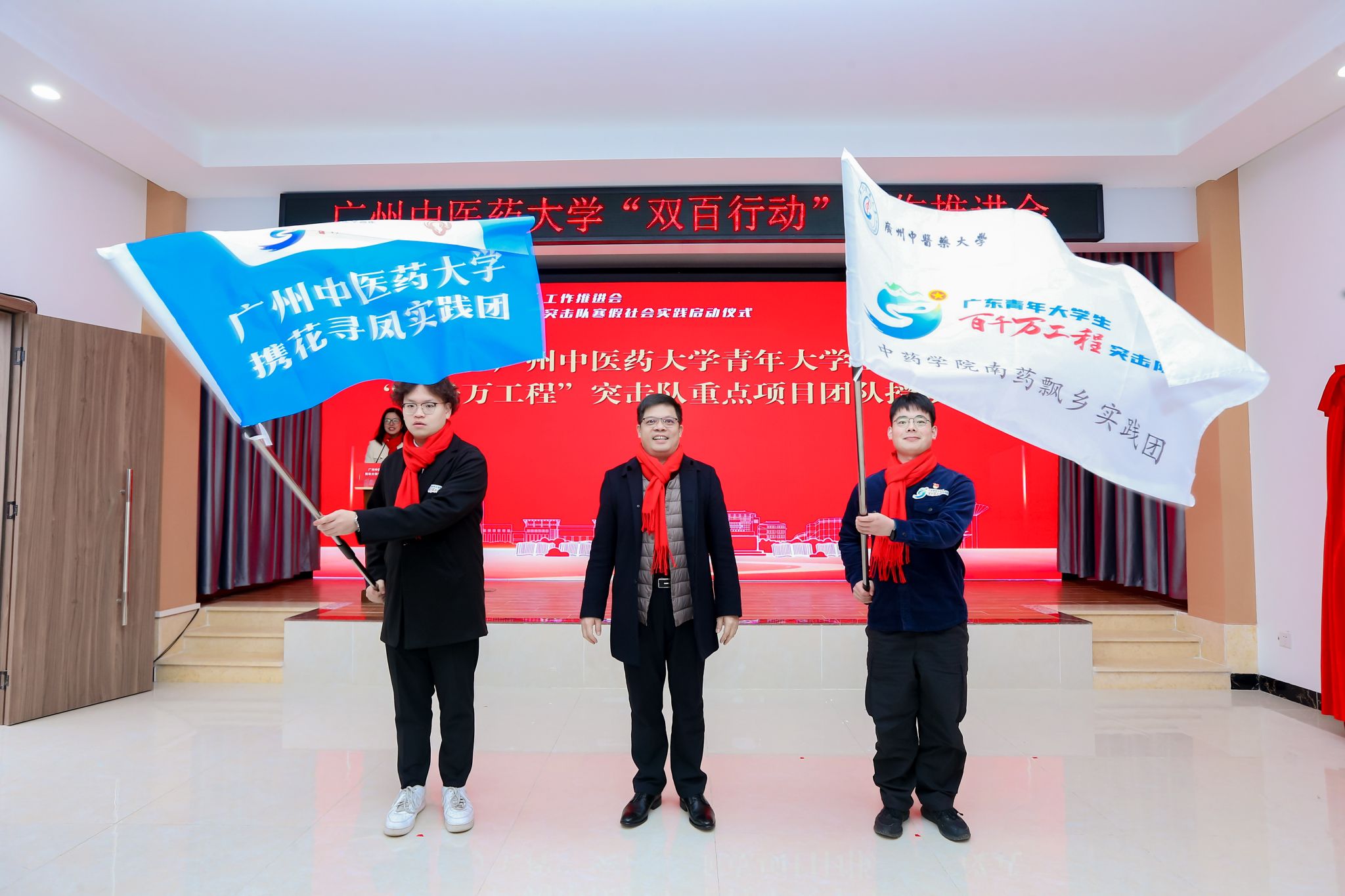 Qiu Yahong, Deputy Secretary of the CPC GZUCM Committee, confers flags on the key project teams of the “Hundred Counties, Thousand Towns, Ten Thousand Villages High-Quality Development Project” College Student Youth Task Group