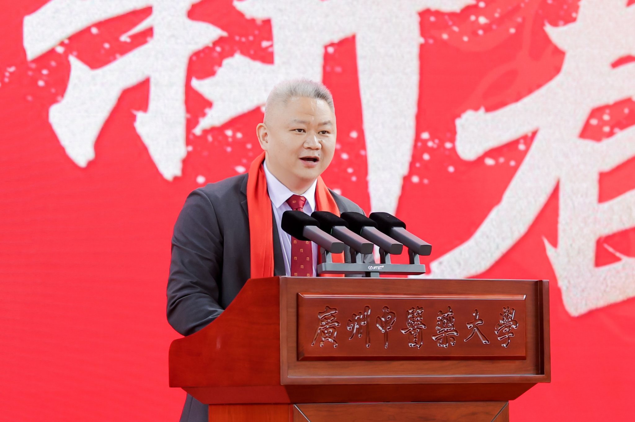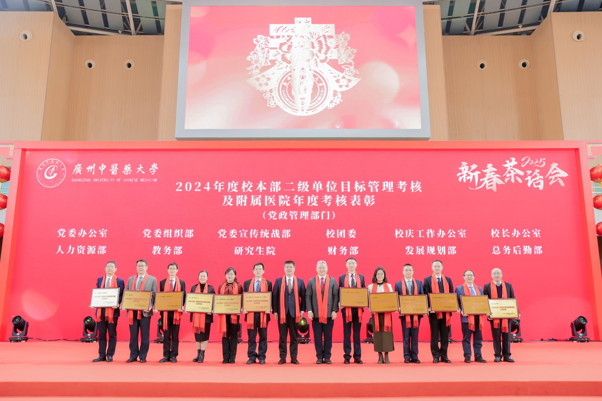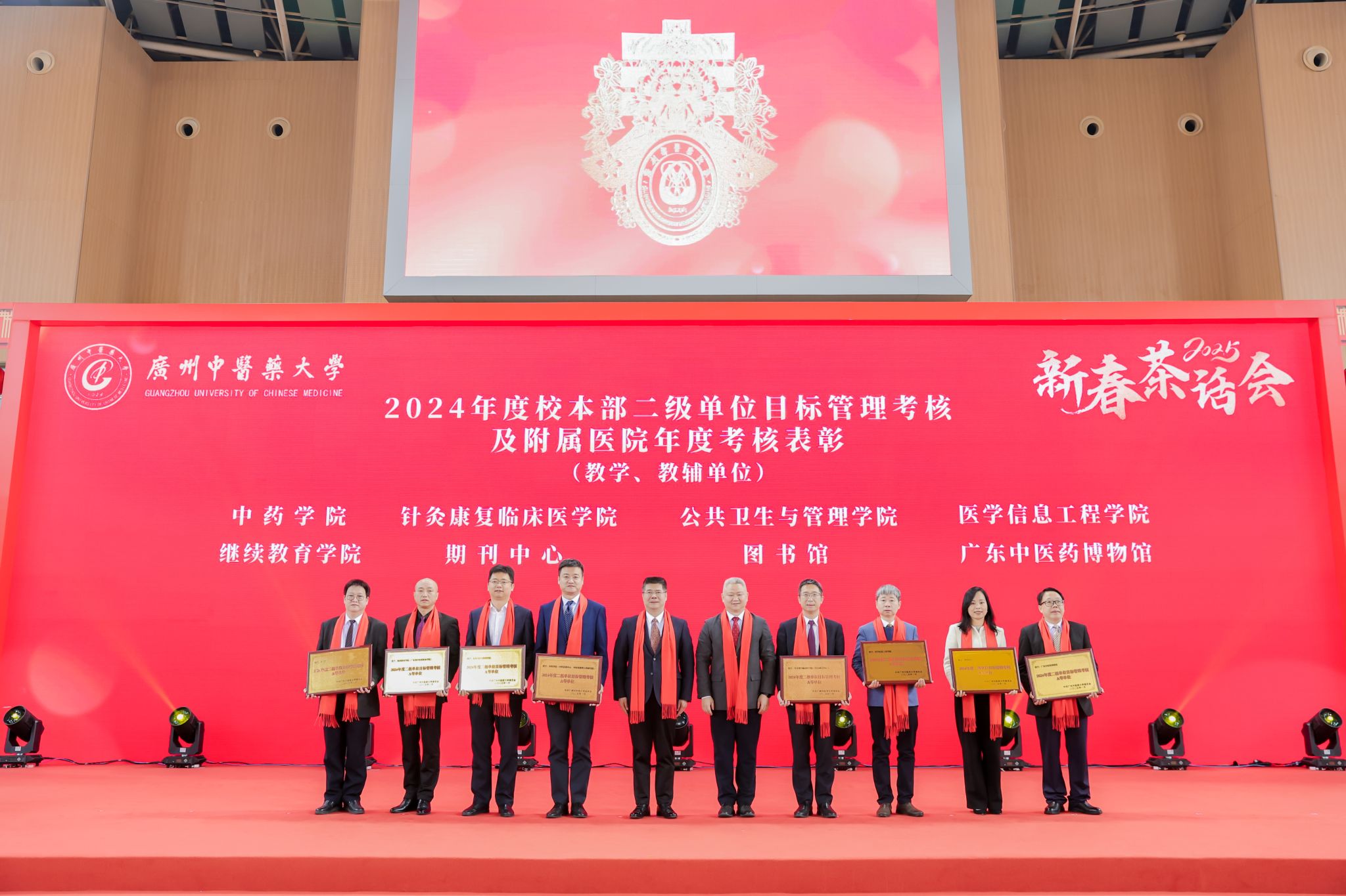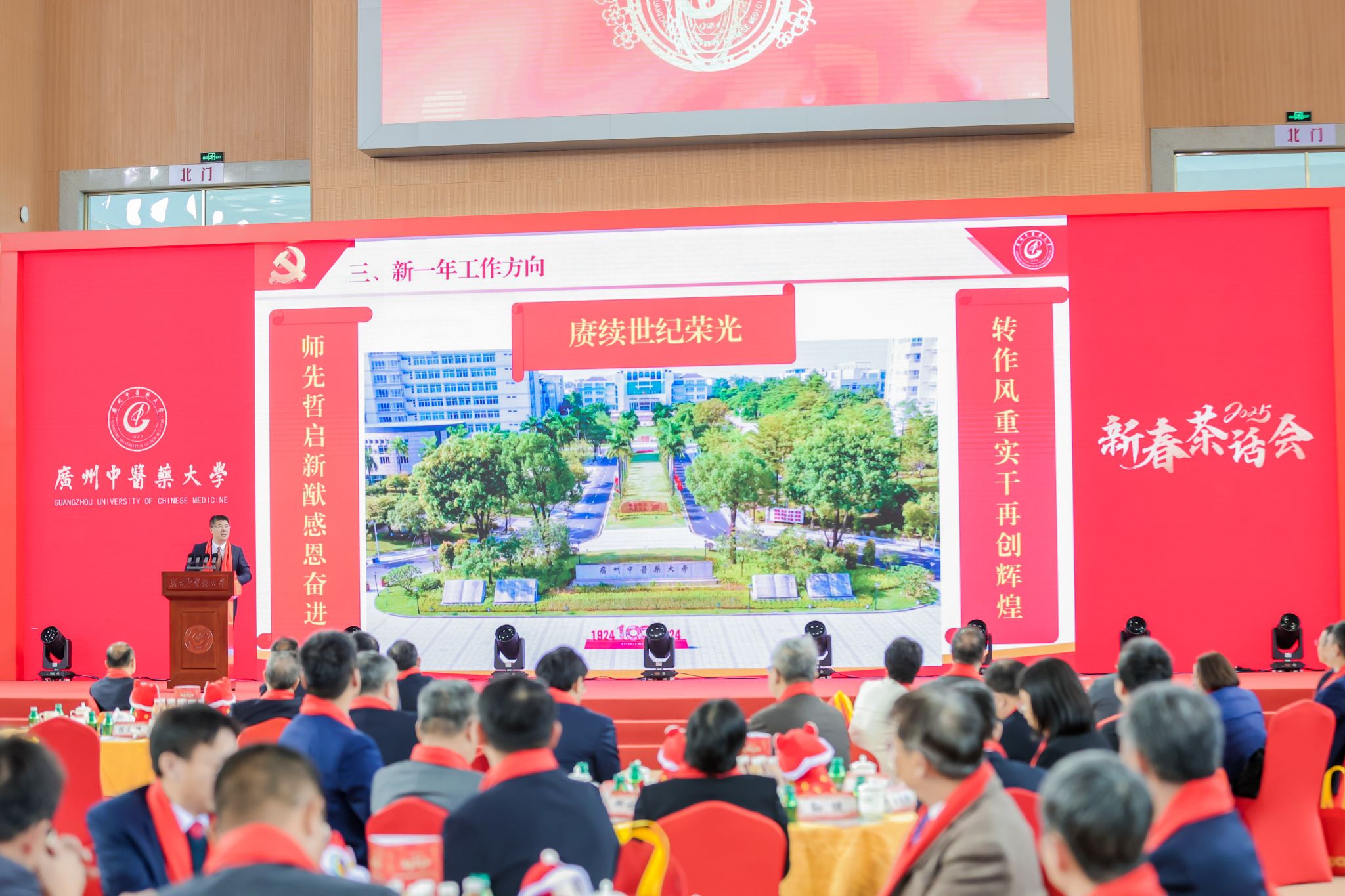 王宏斌强调,2024年习近平总书记来横琴视察粤澳共建中医药高端科技支撑平台,对我校整合多学科先进技术,助力中医药走向世界的做法表示肯定;学校持续开展“转作风、重实干、开新局、争一流”解放思想再出发,以高质量党建引领学校事业高质量发展;成功举办“百年岐黄,逐梦一流”建校100周年系列活动,进一步凝聚人心、汇聚力量;持续深化教育教学改革,顺利通过新一轮本科教育审核评估;构建大思政格局,“一站式”学生社区投入运营使用;召开学科高质量大会,推动学科建设“筑峰造尖”,学科排名实现新突破;坚持外引内培深度协同,稳步推进人才集聚工程;树立“大广中医”理念,大力推动附属医院医疗服务提质增效;学校青蒿抗疟援外团队获“中国青年五四奖章集体”荣誉;提升内部治理效能,校园环境再上新台阶。他表示,新的一年行将开启,要聚精会神抓好高质量发展,在加快建设教育强国、健康中国的时代浪潮中乘风破浪,向着“再造一个新广中医”的宏伟目标奋勇前进!
