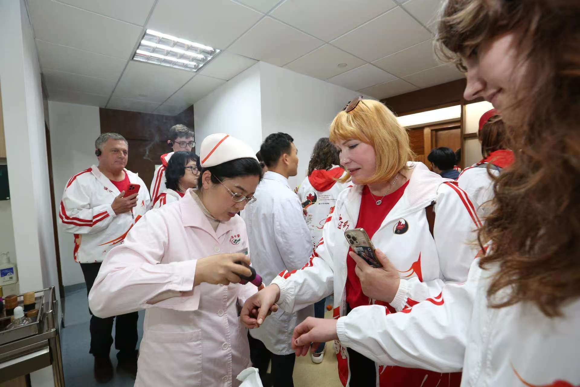 在taptap点点第二附属医院(广东省中医院)大学城院区,岭南甄氏杂病流派传承工作室的张曈老师用生动的案例向交流团讲述了中医在日常生活中的应用。交流团观看和体验了针灸、拔罐、艾灸、雷火灸、棍针等中医药传统疗法,对中医药在疾病预防、治疗和康复方面的优势有了更直观的体会。