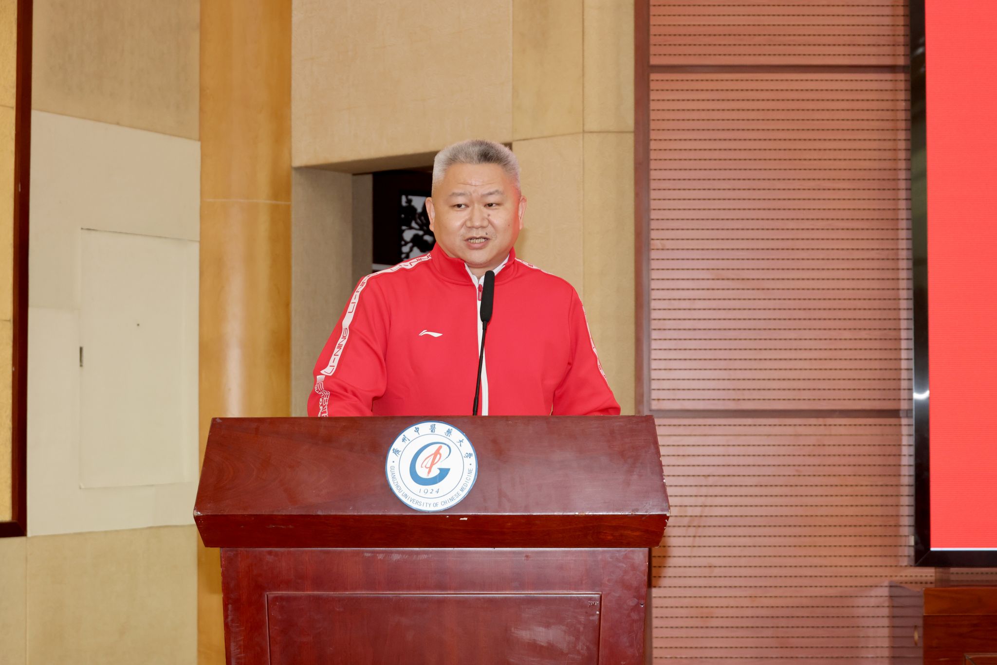 王宏斌在动员讲话中向全体运动员、教练员及保障团队致以敬意与感谢。他鼓励全体代表团成员以“敢为人先”的拼搏精神,锐意进取、勇攀高峰,并提出三点嘱托:一是以中华体育精神为引领,追求卓越。用“更快、更高、更强”的奥运格言激励自我,在赛场上突破极限。二是以中医药文化为根基,团结协作。无论个人或集体项目,均需默契协作,以集体智慧与力量共创佳绩。三是以使命担当为己任,传承荣光。用赛场上的英姿诠释广中医人的风采,彰显新时代广中医学子的活力与使命。