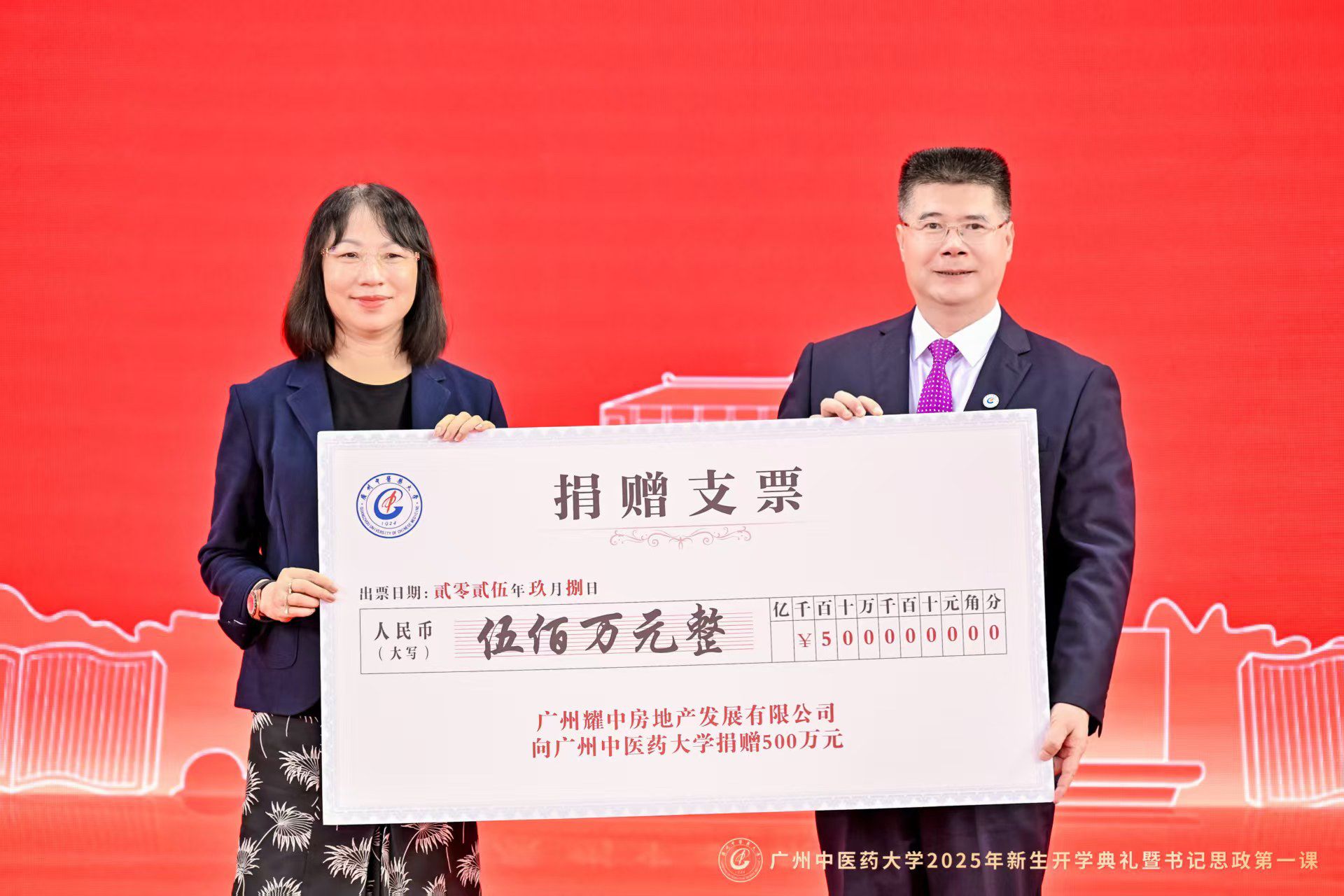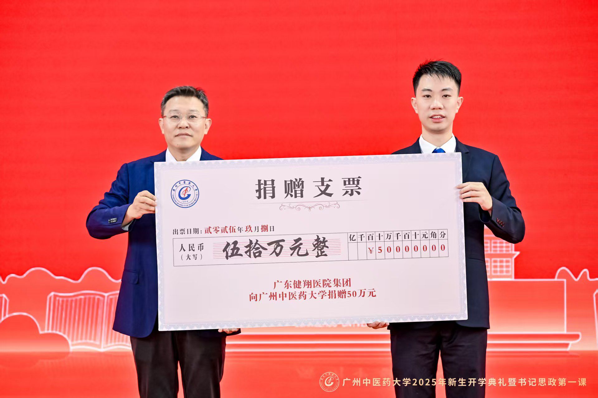 开学典礼上,还举行了“梁宛婷中医药学生奖助学金”“大翔奖助学金”“健翔奖助学金”捐赠仪式。广州耀中房地产发展有限公司副董事长、广州市天河区政协常委梁宛婷女士,大翔医药集团有限公司董事长陈东平先生,广东健翔医院管理集团董事、学校2024届校友龙遨洋先生,分别作为代表向学校捐赠。