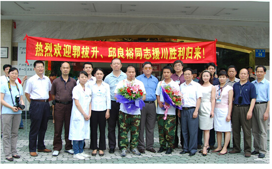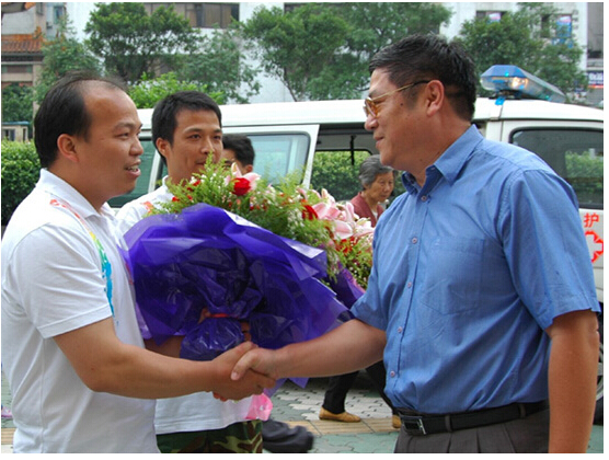 2时40分,车身贴着"taptap点点第一附属医院"的救护车缓缓驶进了门诊南楼门口。风尘仆仆的郭拨升、邱良裕一下车,医院党委书记宋振之等院领导马上激动地上前献花、握手及问好,祝贺他们平安归来,并感谢他们代表医院出色完成了援助灾区人民的光荣任务。