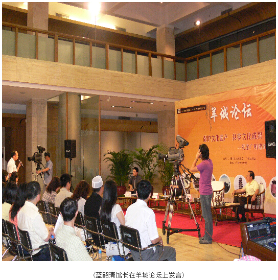 5月18日,我馆参加了由广州市人大、广州市文化局和广州电视台在广州艺术博物院联合举办的《羊城论坛》节目,参加以"保护文化遗产,共享文化成果——纪念广州建城2222年"为题的讨论,就近段时间来媒体所热议、市民所关注的广州市博物馆免费开放和文化遗产保护等问题,发表了意见。