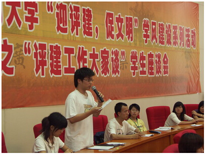 座谈会由学生处林彬处长主持。林处长首先介绍了学校学风建设工作的四个阶段及开展"评建工作大家谈"学生座谈会的背景。林培政副校长围绕着三个方面发表讲话:1、什么是评估;2、评估评什么;3、与我们的关系、我们应该怎么做。他强调了评估的法律性及其在与世界高等教育接轨的实际意义,阐明了高等教育质量提升的必要性及本科评估对学校、学生切身利益的影响,他还详细说明了评估的具体步骤,希望全校师生均应树立主人翁意识,养成"学校光荣、我光荣"的思想,认真做好评建工作。