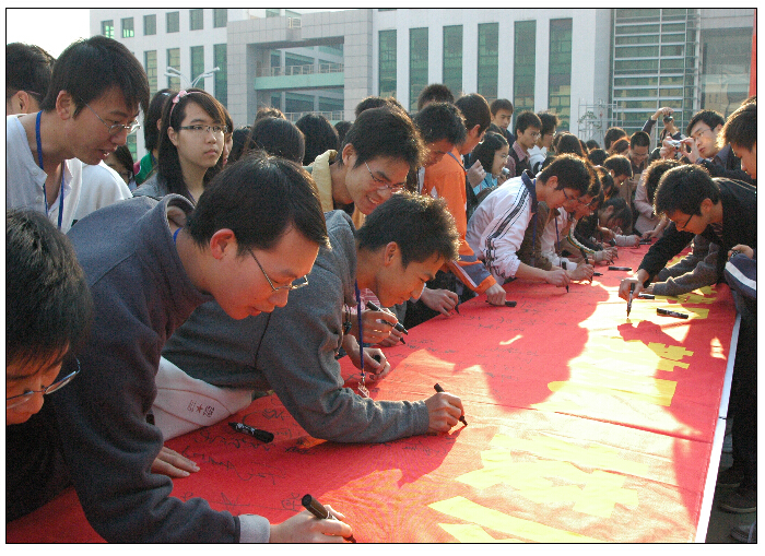 学校徐志伟校长为学生督察队授旗后,校领导带头在"taptap点点争创一流学风、教风、校风"签名红绸上庄严签名,接着参会的上万名师生员工陆续签名,拉开了我校"争创一流学风、教风、校风"活动的序幕。本次活动将维持3个多月,期间将举办包括师德宣传教育活动、学风建设活动在内的一系列活动,在广大教师中通过深入学习胡锦涛总书记在接见全国道德模范及在全国优秀教师座谈会上发表的重要讲话,开展"师德建设"征文、"师德标兵"、"师德建设先进集体"评选、"师德师风"建设演讲比赛等活动,在全校掀起学先进模范、树文明风尚的热潮,大力倡导"爱岗敬业、关爱学生;刻苦钻研、严谨笃学;勇于创新、奋发进取;淡泊名利、志存高远"的师德风尚,增强教师的光荣感、责任感和使命感,激发教师崇教厚德、教书育人的热情,形成 "爱国敬业、笃学育人,与时俱进"的教风;在广大同学中通过开展多种形式的学风教育活动,促进校园文明建设、学风考风建设、宿舍文化建设、校园文化建设,引导学生内强素质,外塑形象,形成良好的学习氛围,养成文明的行为习惯和健康的生活方式,努力提高思想政治素质、道德水平和个人综合素质,全面营造文明、健康、团结、和谐的校园氛围。