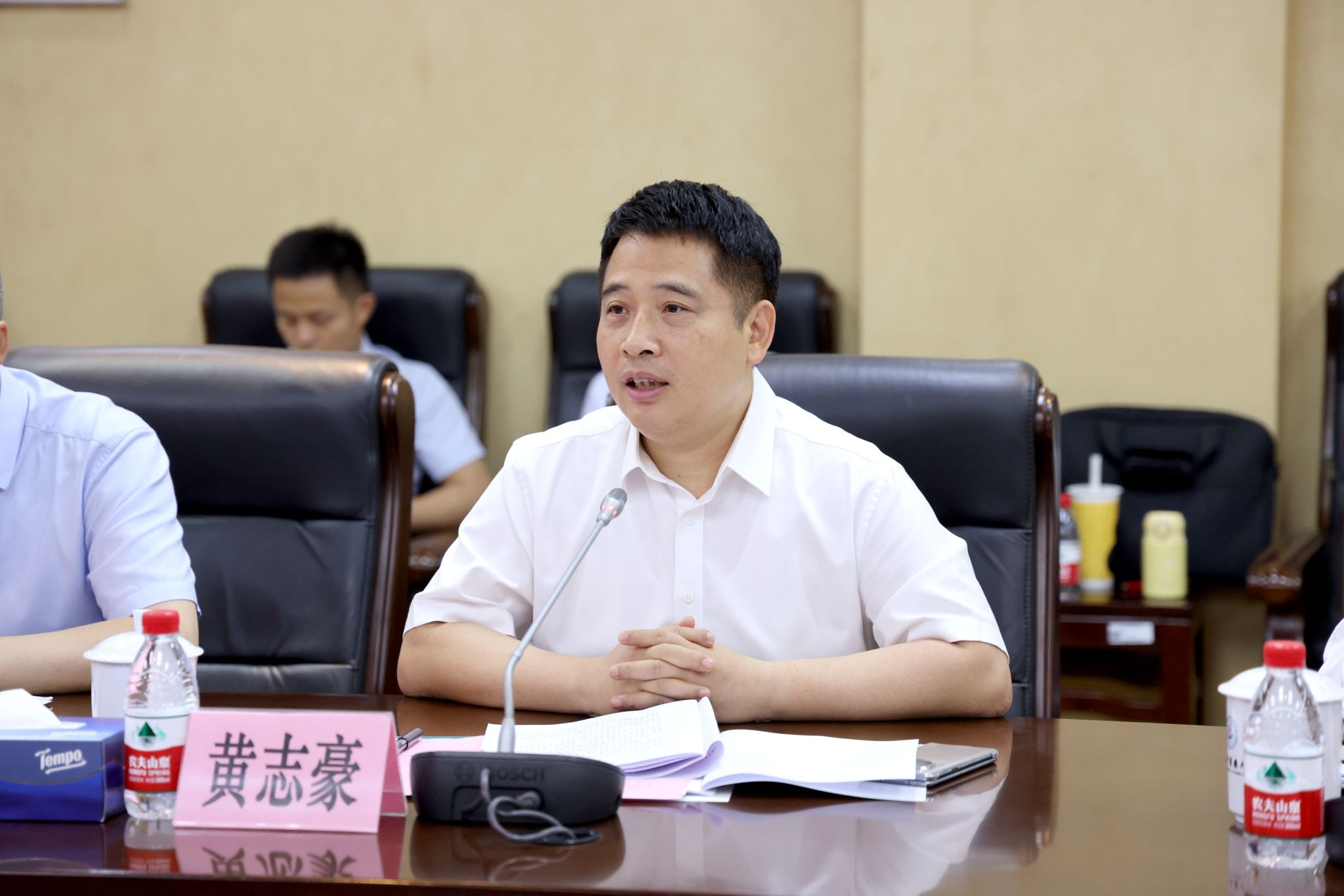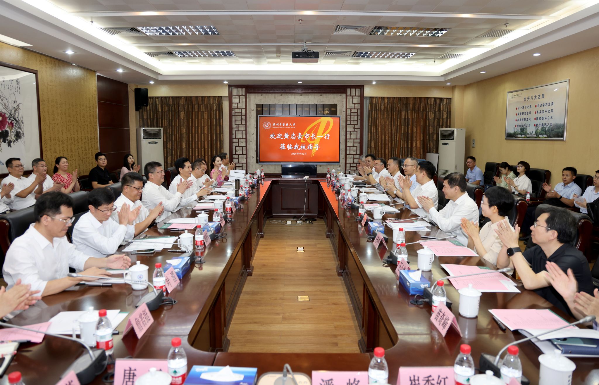 9月12日下午,珠海市委副书记、市长黄志豪率队来校调研,学校党委书记陈文锋,党委副书记、校长王伟与黄志豪一行围绕深入学习贯彻党的二十届三中全会精神,落实习近平总书记在珠海横琴新区粤澳合作中医药科技产业园考察时重要指示精神,共商深化校政合作发展,加强中医药产学研用深度融合,培育中医药新质生产力,助推珠海中医药事业传承创新发展进行座谈交流。学校党委副书记邱亚洪、副校长刘中秋、国际校区筹建办主任梁沛华,珠海市副市长黄振球,珠海市政府党组成员、秘书长文华,珠海市政府副秘书长王玲萍等参加座谈。
