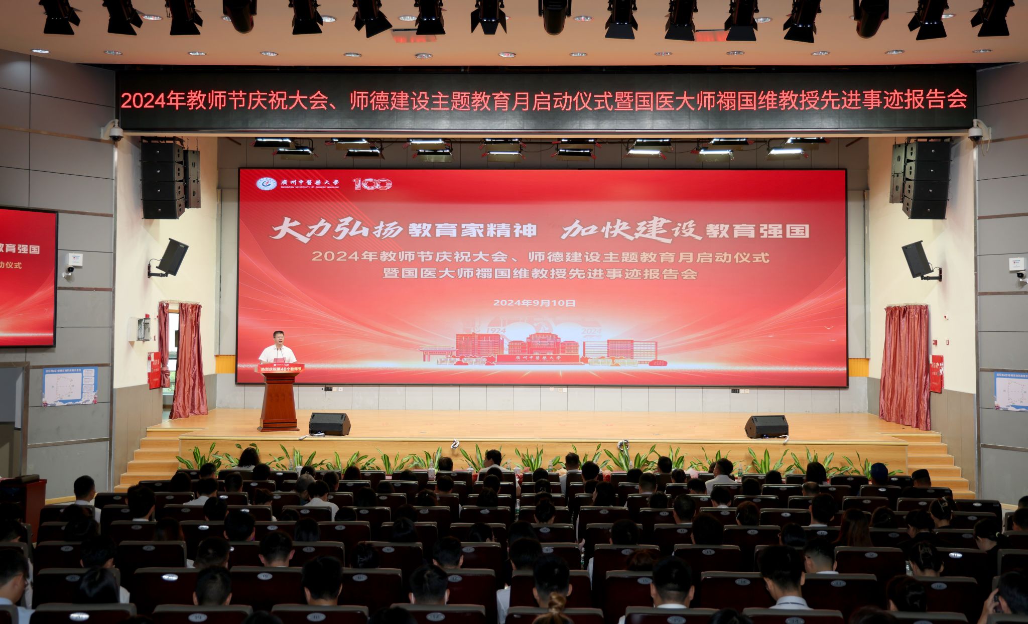 9月10日上午,我校2024年教师节庆祝大会、师德建设主题教育月启动仪式暨国医大师禤国维教授先进事迹报告会在大学城国际会议厅隆重举行。活动主题为“大力弘扬教育家精神,加快建设教育强国”。学校领导、受表彰教师代表、2024年新入职教师代表、各教学科研教辅单位负责人、各党政管理部门负责人以及教研室主任、教职工代表、学生代表400余人齐聚一堂,共同庆祝第40个教师节。大会由潘华峰副校长主持,并宣布师德建设主题教育月活动启动。