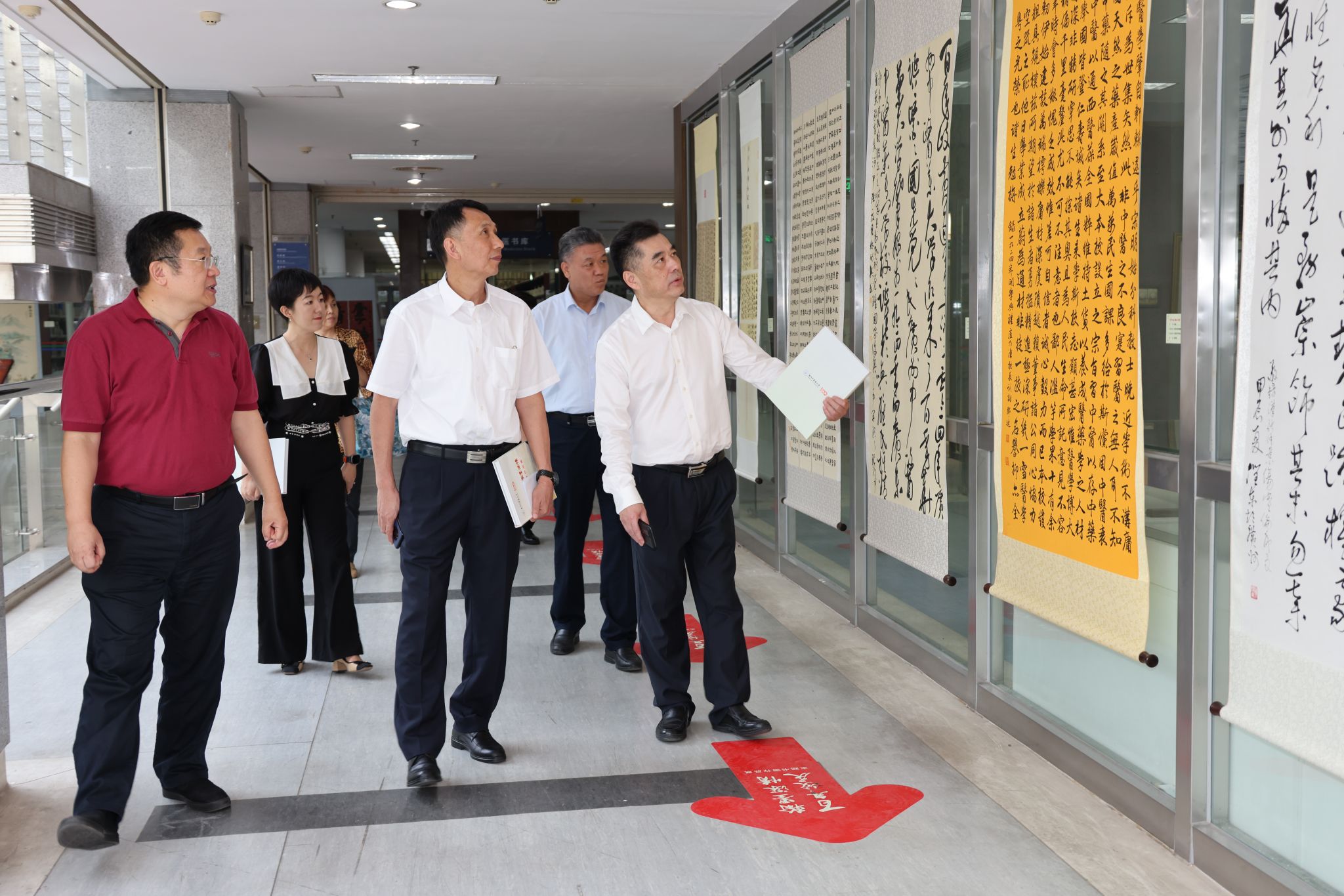随后,郭鸿和师生代表一起到图书馆三楼饶有兴致地参观了书画展览。