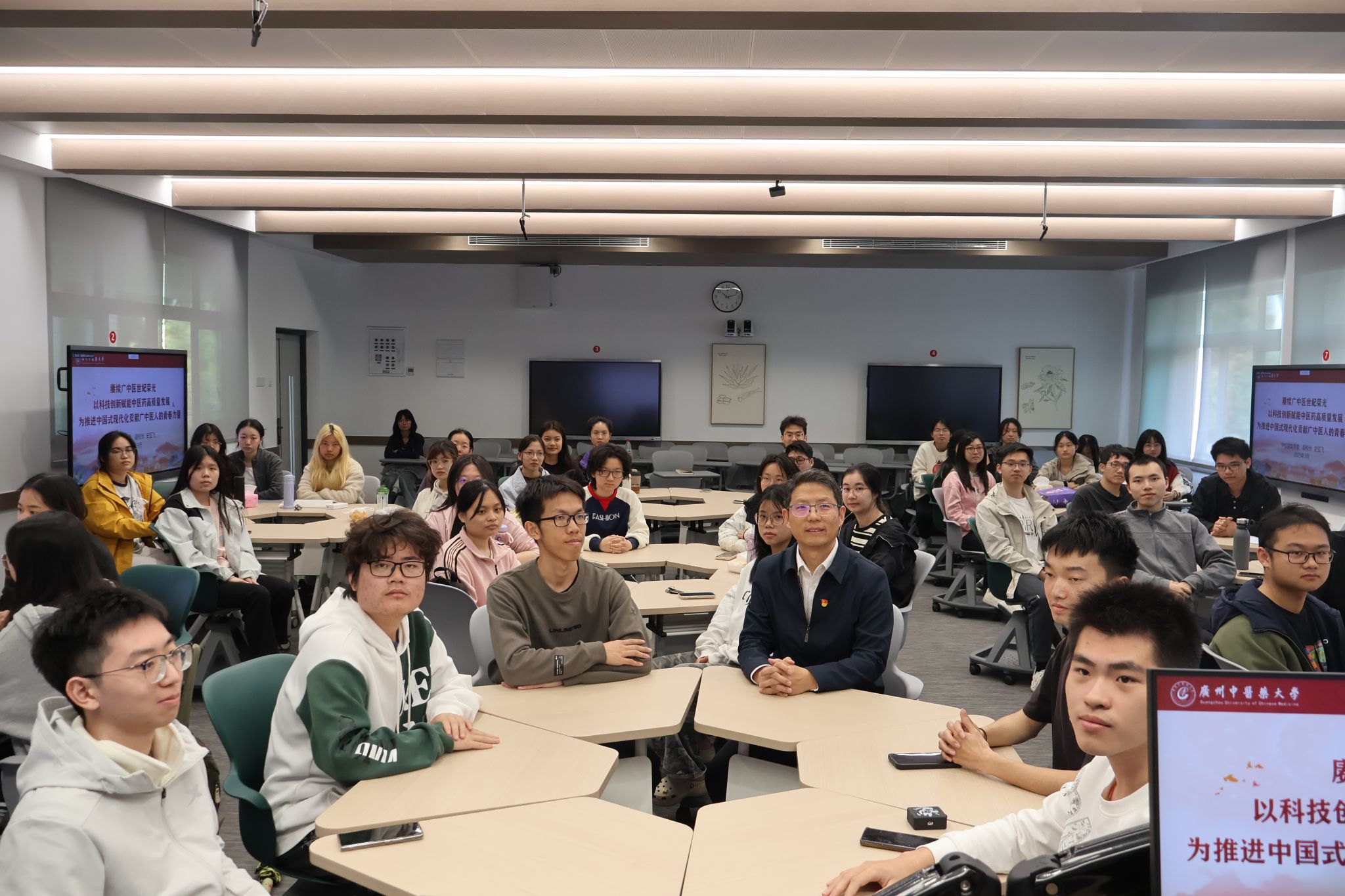 3月21日上午,学校党委常委、副校长史亚飞以“赓续广中医世纪荣光,以科技创新赋能中医药高质量发展,为推进中国式现代化贡献广中医人的青春力量”为题,在大学城校区教学楼为基础医学院2022级中医养生专业55名学生讲授春季学期“思政第一课”。