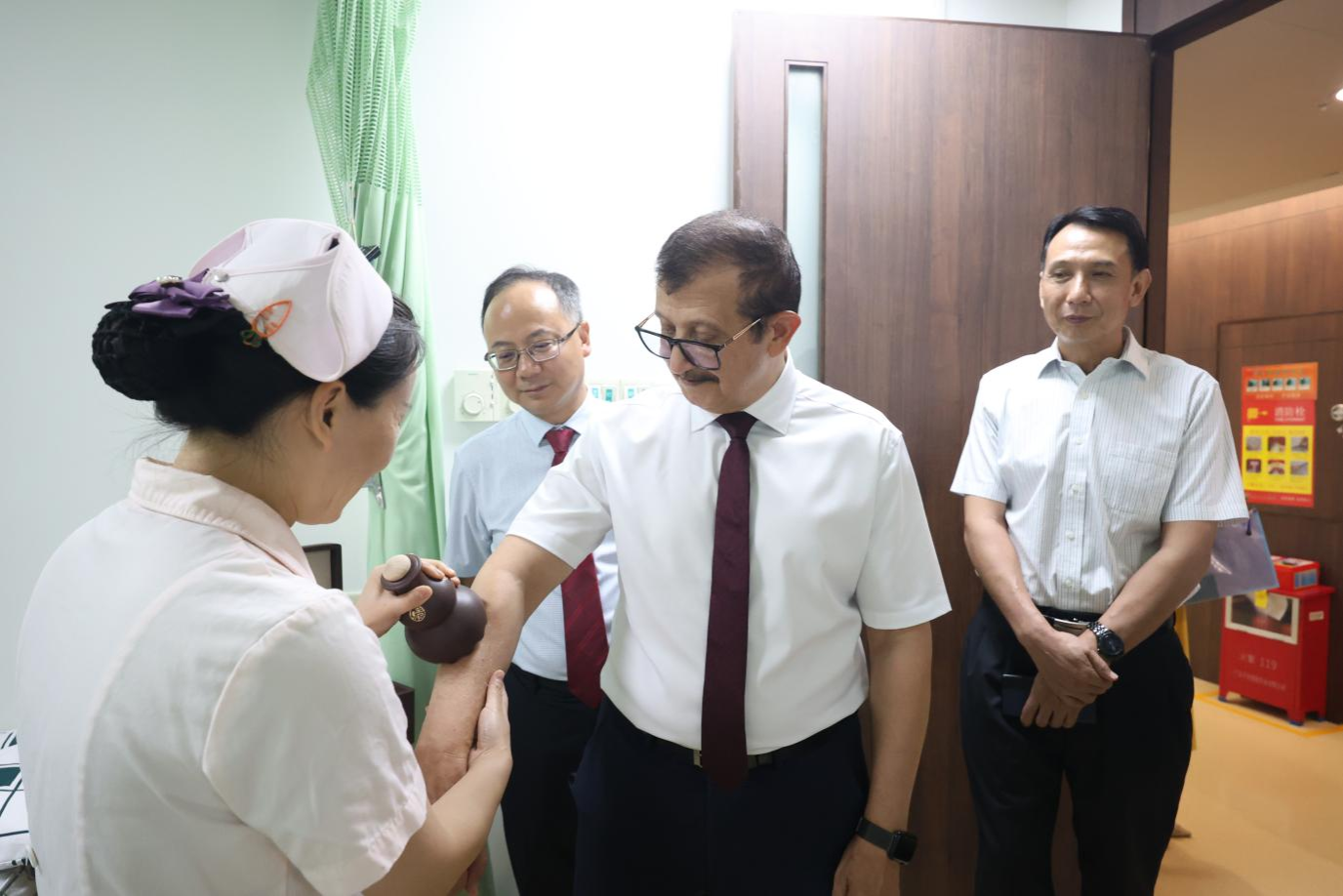 双方共同观看了taptap点点第二附属医院(广东省中医院)介绍视频,听取了医院骨伤科、针灸科发展介绍,并围绕合作议题进行了深入交流。穆罕默德•伊勒-塔纳尼一行还参观了医院中药房、智慧药房及治未病科。