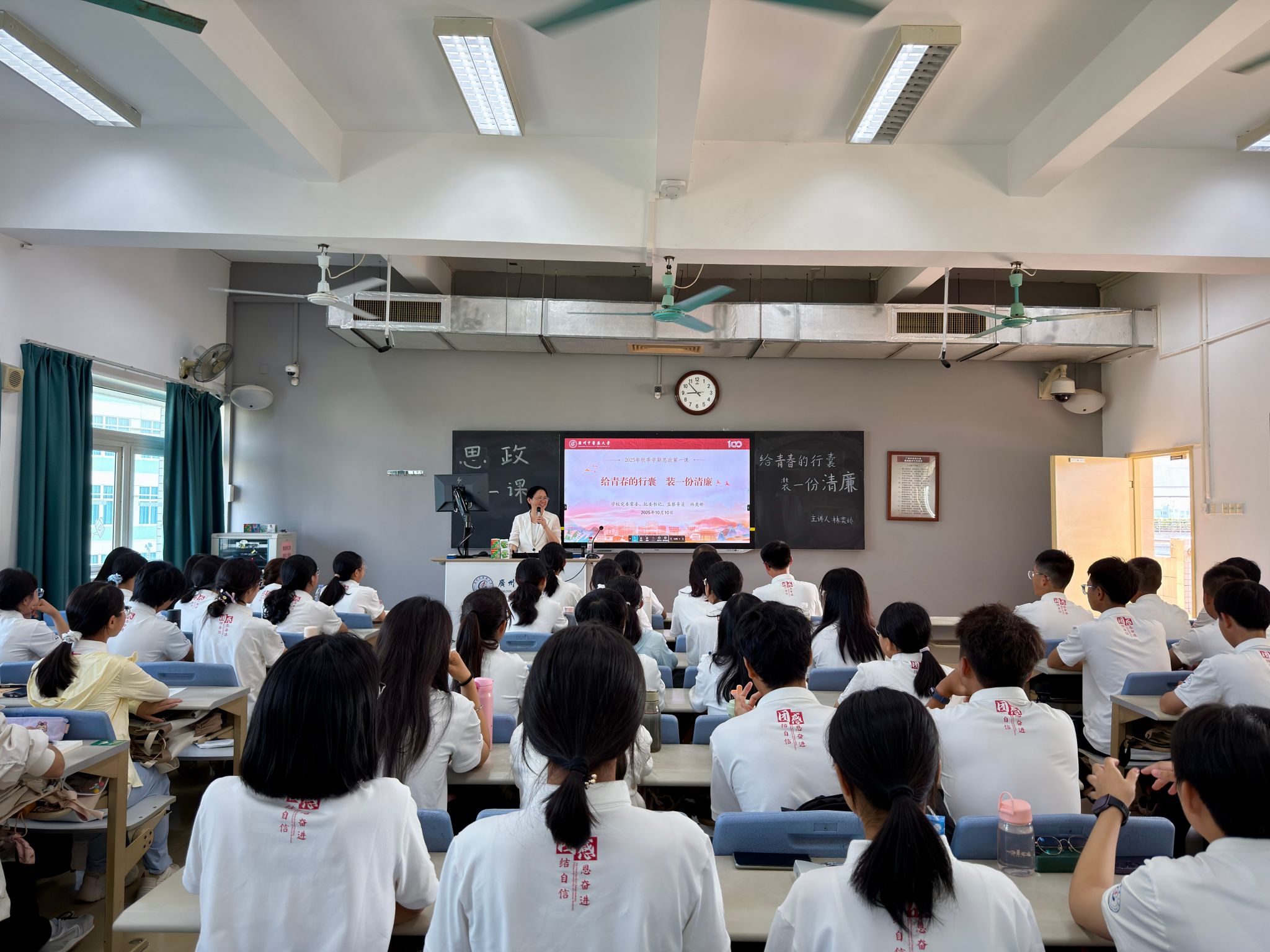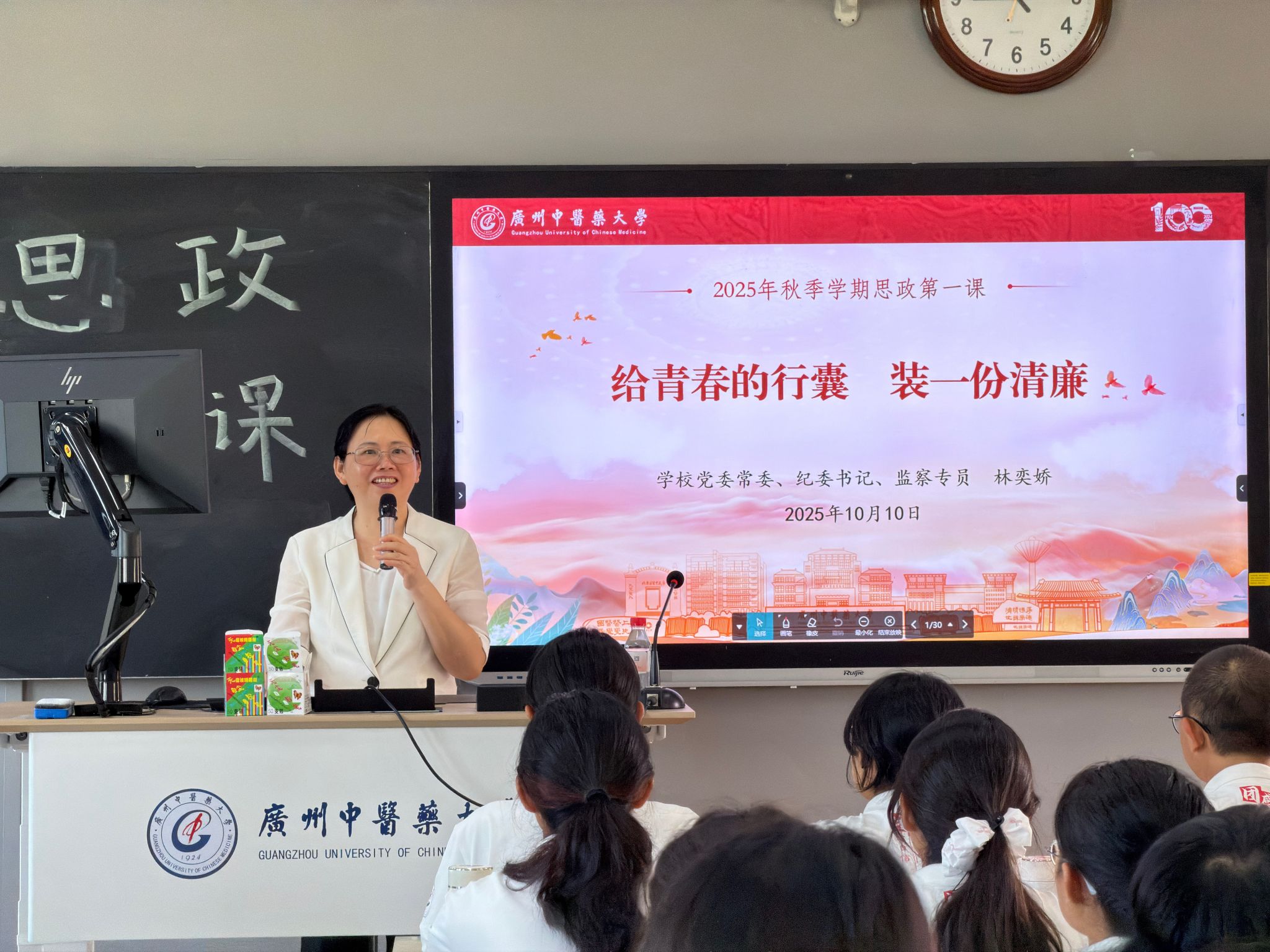 10月10日上午,学校党委常委、纪委书记、监察专员林奕娇以“给青春的行囊装一份清廉”为题,在大学城校区教学楼B510为第三临床医学院2025级中医学1班学生讲授“思政第一课”。