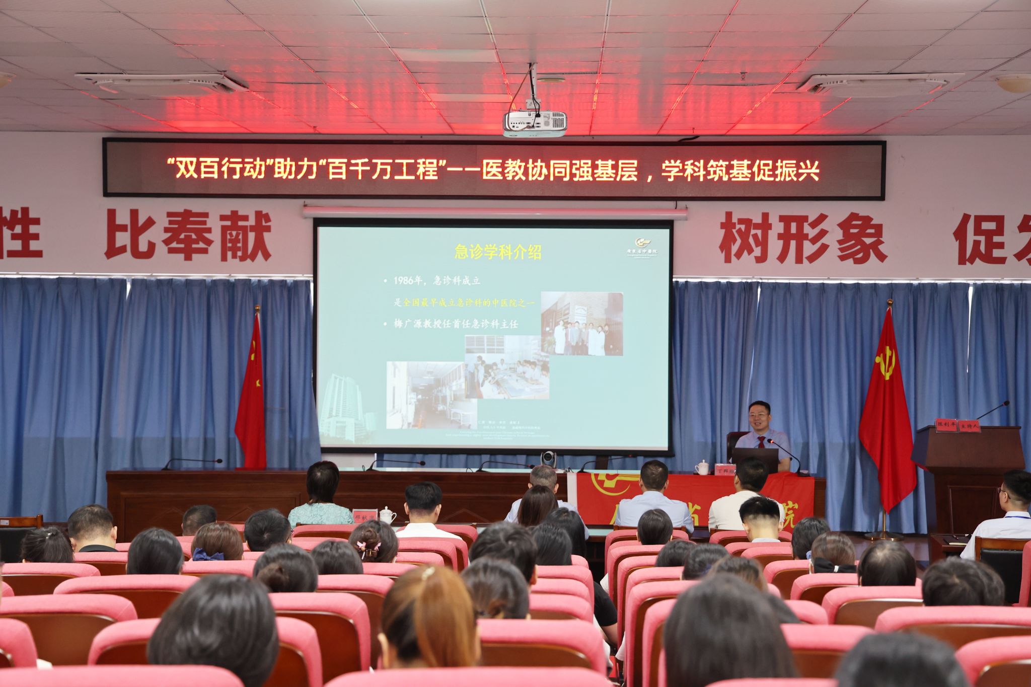同期,在四楼阶梯教室举办了专题培训讲座。民盟丁邦晗主委,二附院急诊科主任奚小土、急诊大科护士长邓秋迎等分别就急诊科建设、心肺复苏、海姆立克急救法及中医特色疗法在急诊中的应用进行授课与实操指导,有效提升了基层医护人员的应急救治与中医药服务能力。