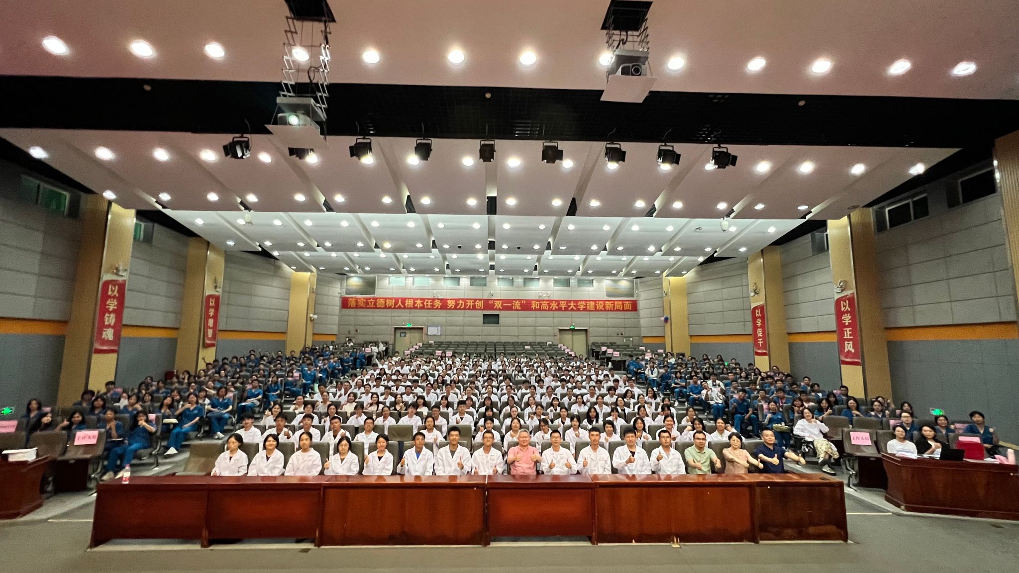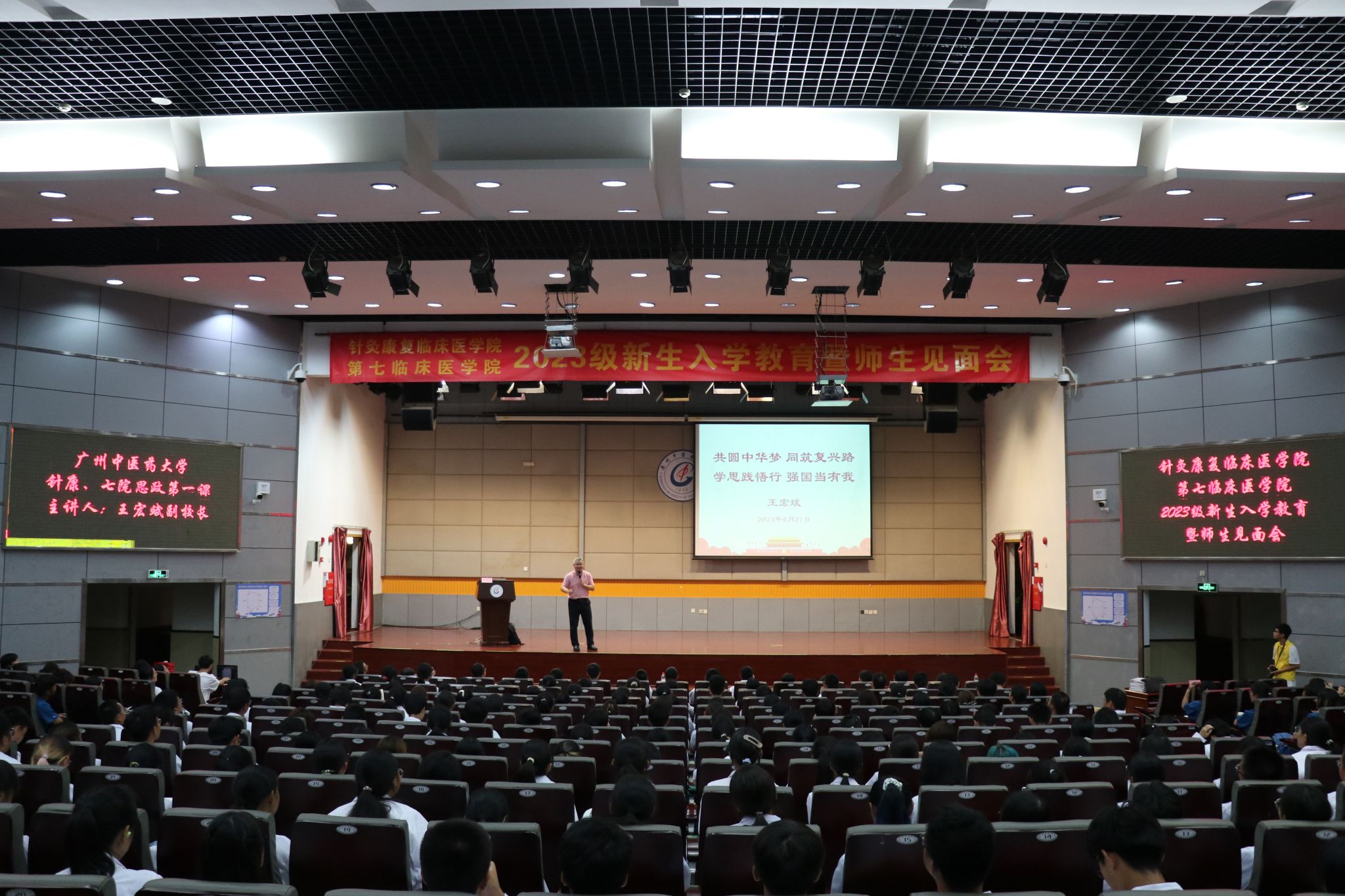 9月21日晚,副校长王宏斌在大学城校区国际会议厅为针灸康复临床医学院、第七临床医学院2023级全体新生讲授题为《共圆中华梦,同筑复兴路;学思践悟行,强国当有我》的新学期思政第一课。