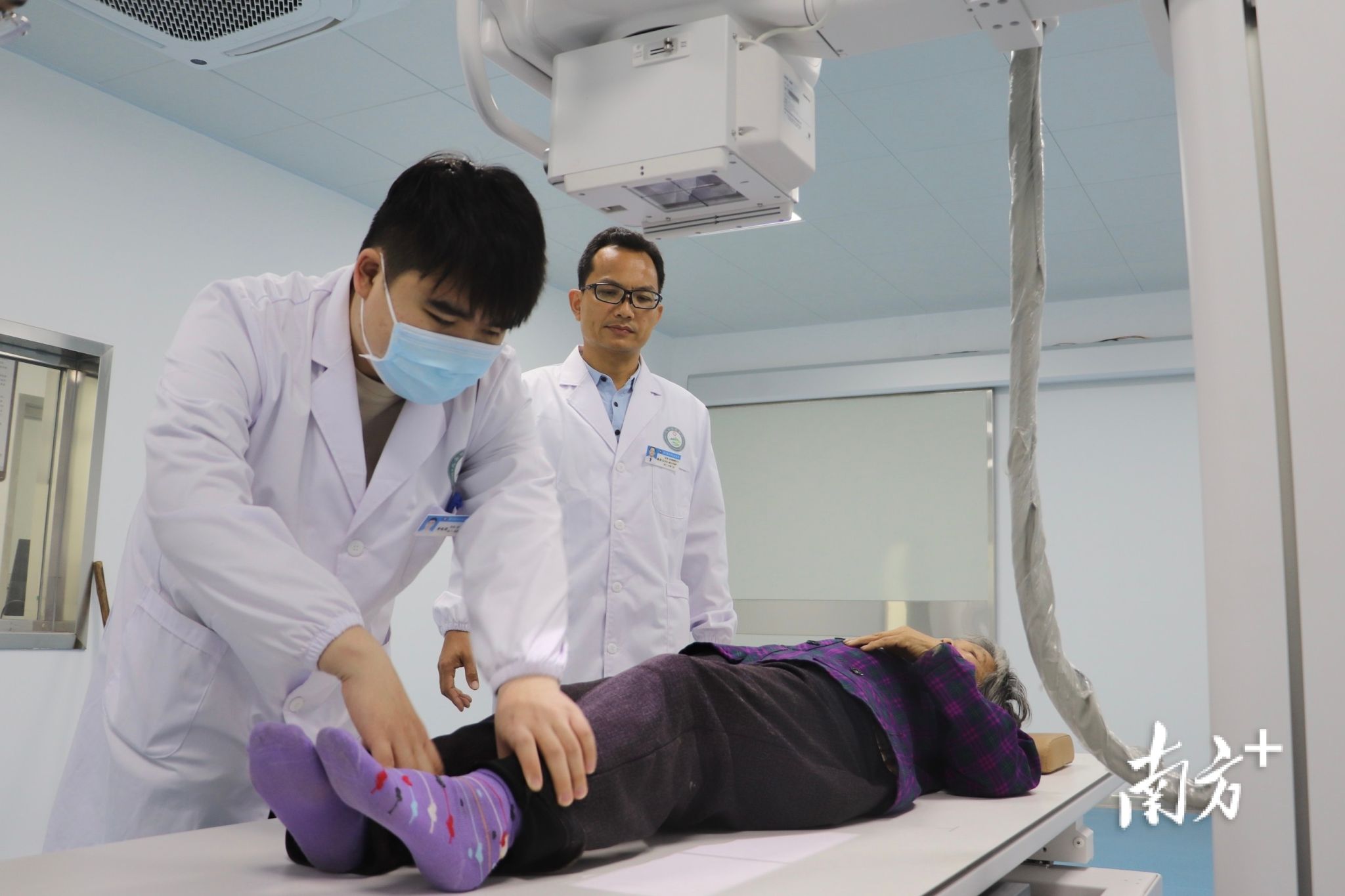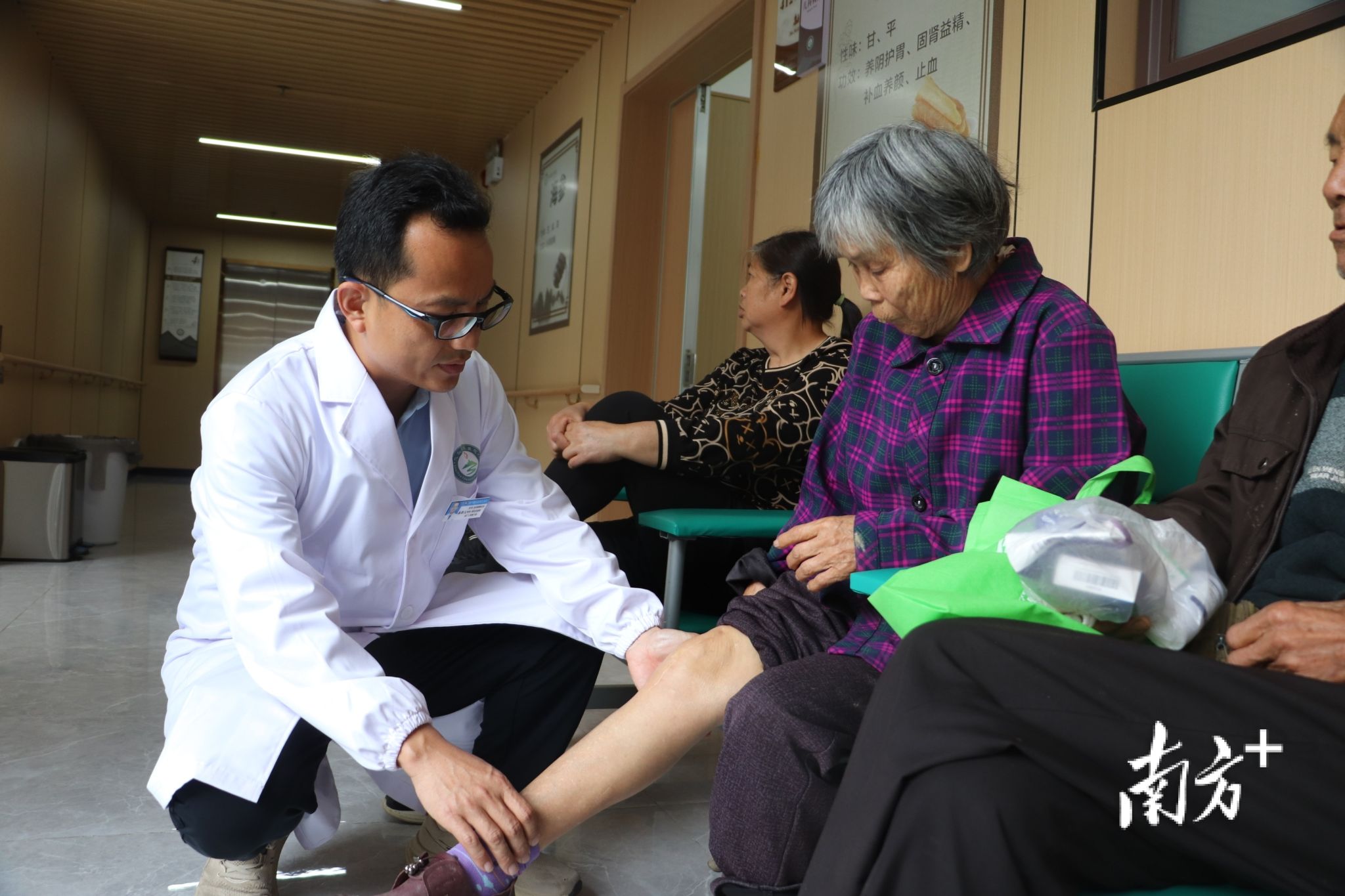 徐浩祥到迳头镇中心卫生院查房,检查患者腿部。