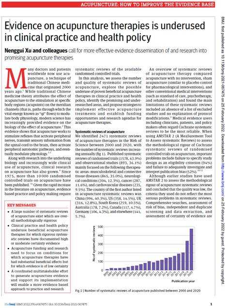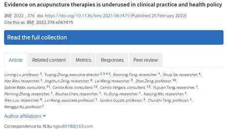 据悉,《英国医学杂志》(BMJ)是英国医学会会刊,是世界四大顶级医学期刊之一,与《新英格兰医学杂志》(NEJM)、《柳叶刀》(The Lancet)及《美国医学会杂志》(JAMA)齐名。此次发表的研究论文《基于临床证据体的针灸疾病图谱研究》的通讯作者许能贵为taptap点点国家“973计划”项目首席科学家、中国针灸学会副会长、华南针灸研究中心主任;第一作者为临床研究与大数据实验室陆丽明教授、华南针灸研究中心副主任唐纯志教授、加拿大McMaster大学张誉清助理教授,Gordon Guyatt杰出教授(循证医学之父)以及Epistemonikos数据库研究人员等为共同完成人。该论文是许能贵教授团队继2019年获国家科学技术进步二等奖后,再次取得的突破性研究成果,有利于进一步带动我国中医药与针灸临床证据推广应用,为其进一步走向国际奠定基础。