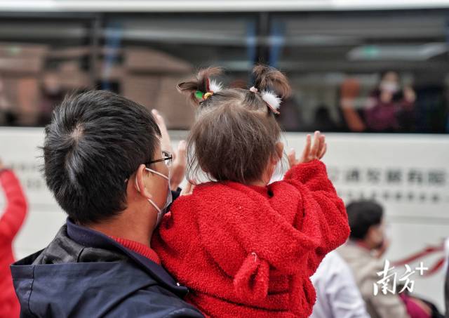 12时30分,小雨迷濛,大巴车缓缓驶离中山一院,工作队队员、护士张清容隔着车窗向人群挥手致意。她的丈夫和2岁半的女儿来到现场送行。丈夫表示,女儿虽然还不太明白妈妈要去做什么,但从小就对医护人员的工作充满崇敬和向往之心。“知道太太主动报名支援香港,我特别理解和支持,希望她早日安全归来,和我们一家团聚。”