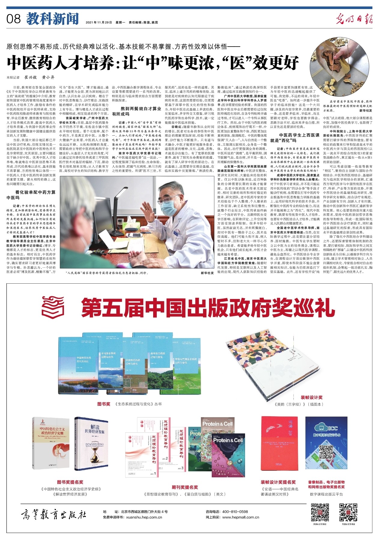 全国老中医学术传承导师、南京中医药大学教授杨进:当然,在实际教学过程中,还是要注意分层培养、因材施教。中医专业学生要树立以中医为主的培养理念,课程以中医为主,再辅之以现代医学课程,避免全盘西化。中西医结合专业学生,在课程设计方面应做到中西医学并重,即使本科阶段不能全盘掌握相关知识,也能为后续深造打下坚实基础。此外,还有学校开设“纯中医”试点班级,绝大部分课程都是中医,加强中医经典学习,也取得了良好的成效。