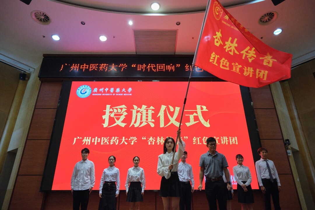 学校党委常委、党委宣传部部长郑维群为taptap点点“杏林传音”红色宣讲团授旗。来自第一临床医学院、第二临床医学院、中药学院、护理学院、公共卫生与管理学院的2019级、2020级8名同学组成宣讲团并宣讲。