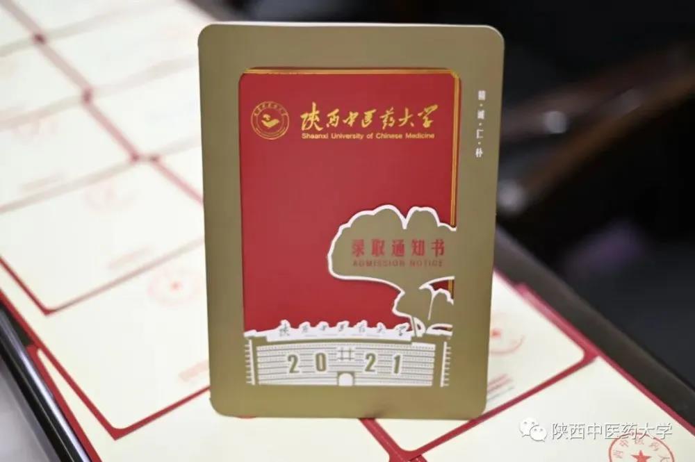 陕西中医药大学录取通知书封套融入“折叠式相框“理念,既可以封装珍藏版通知书,也可以承载你与录取通知书的合影留念,将照片存放于相框内,将记忆留存。