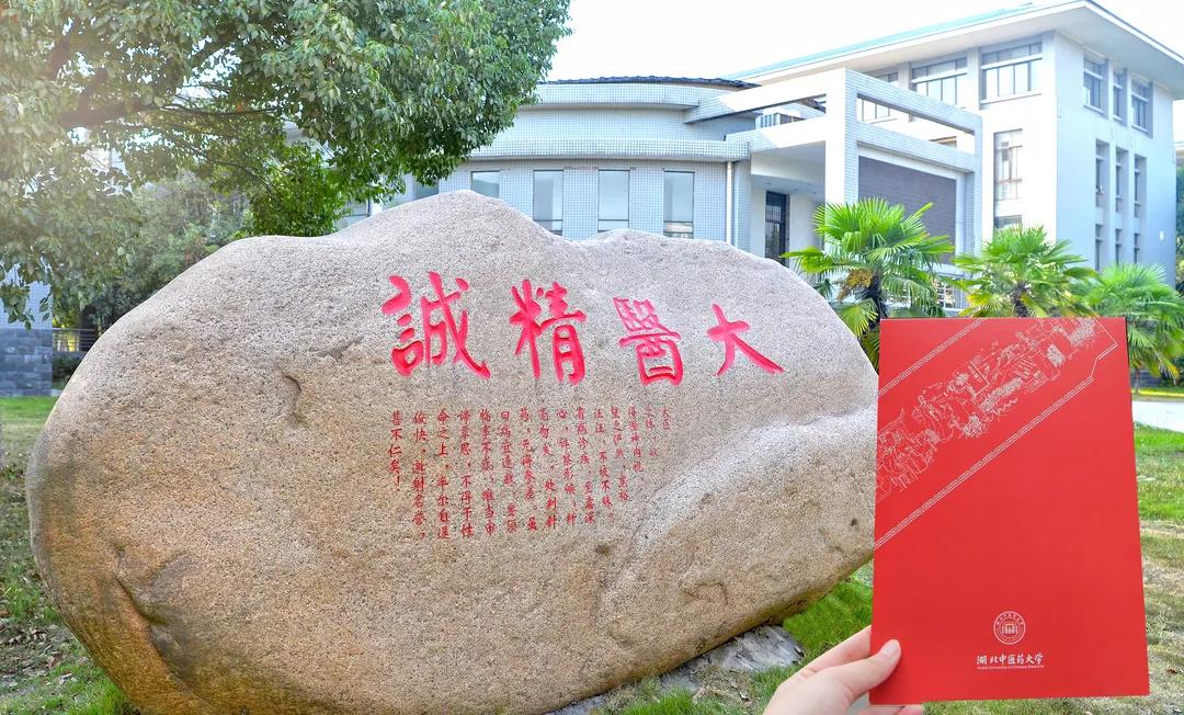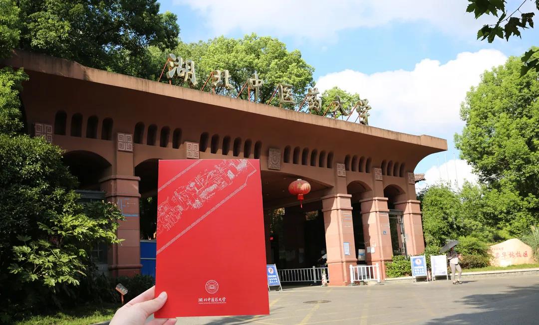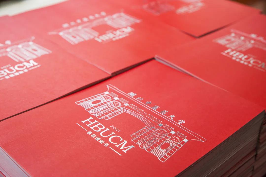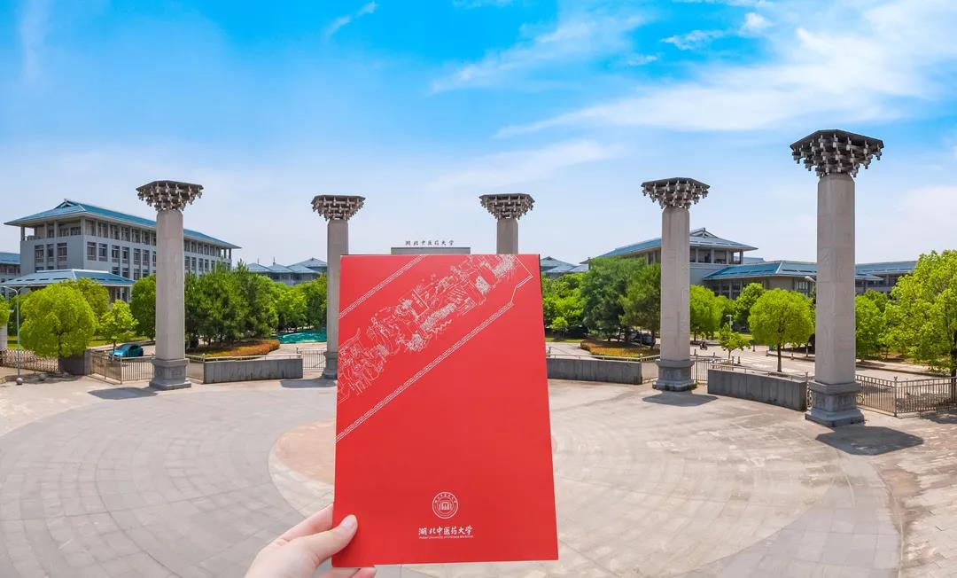 湖北中医药大学2021年本科录取通知书为信笺样式,以红色为主基调,采用烫银工艺手绘。李时珍广场大型浮雕——“九九图”中医文化墙、五行柱正大门、图书馆等学校标志性建筑跃然纸上。古今结合,体现出浓厚的中医药特色。