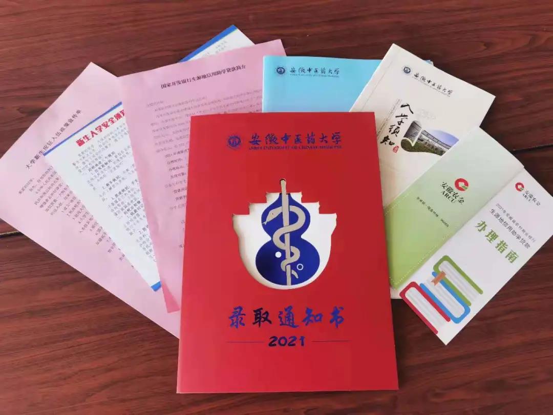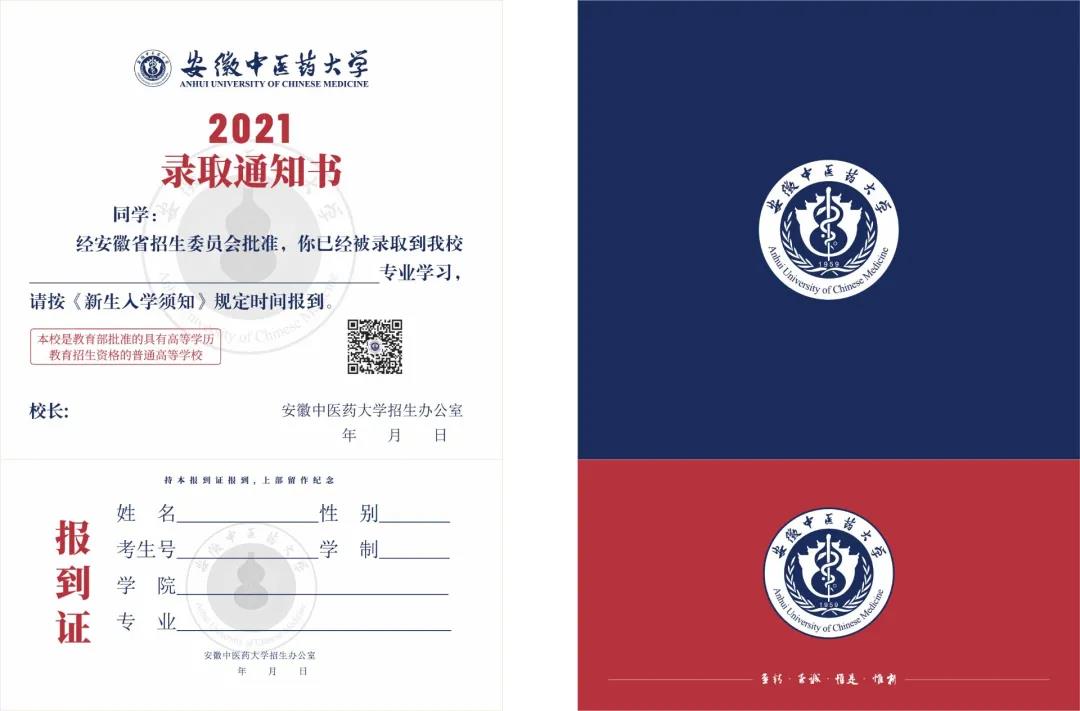 安徽中医药大学录取通知书以红蓝两色为主色调,封面镂空镌刻中校徽图案,寄予了对莘莘学子的希望。