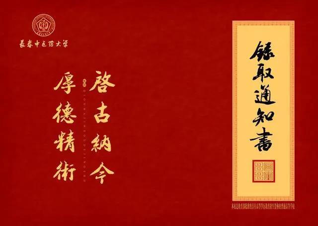 长春中医药大学录取通知书体现长春中医药大学的求“真”精神。录取通知书封面采用长春中医药大学金色校训“启古纳今,厚德精术”,加上汉语拼音组合校训,增加国际视觉感受,体现中医必将走向世界的大爱格局。