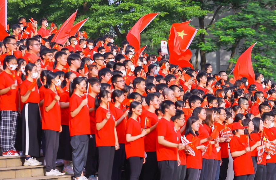7月1日的清晨,taptap点点的校园里红旗招展、歌声激昂,2600名师生井然有序地站在学校国旗广场上,举行“永远跟党走”升旗仪式暨师生歌咏活动,以饱满的爱党爱国热情庆祝中国共产党成立100周年。升旗仪式开始前,学校领导与师生一起大合唱,把歌声献给党,从《光荣啊!中国共青团》《我们走在大路上》到《学习雷锋好榜样》,满怀激情的歌声响彻校园。升旗仪式庄严而肃穆,学校的国旗护卫队迈着铿锵有力的步伐走向升旗台,雄壮的国歌响起,鲜艳的国旗升起,现场全体师生肃然而立,行注目礼,齐唱国歌。五星红旗下,学校党委书记张建华发表讲话,她表示:“我们党100年的历史是一部奋斗的历史、光辉的历史、催人奋进的历史,我们要用党的奋斗历程和伟大成就鼓舞斗志、指引方向,用党的光荣传统和优良作风坚定信念、凝聚力量,用党的历史经验和实践创造启迪智慧、砥砺品格,我们要继往开来、赓续红色血脉,沿着革命先烈的足迹前进。”她鼓励老师们向“七一勋章”获得者、优秀教师张桂梅学习,争做“四有”好老师,培养更多更好的优秀中医药人才;她鼓励同学们听党话、跟党走,掌握好为人民服务的本领,为中华民族的伟大复兴事业添砖加瓦,贡献青春力量。在她的带领下,在场师生再次把歌声献给党,《保卫黄河》《团结就是力量》《没有共产党就没有新中国》……一首又一首的经典歌曲饱含着百年的红色记忆,嘹亮的歌声令所有人都沉浸其中。在歌声中,由学生组成的字操方阵随着音乐变换出“100”“1921”“2021”和党徽等图形,热烈庆祝党的百年华诞。在《歌唱祖国》的大合唱中,活动圆满结束。