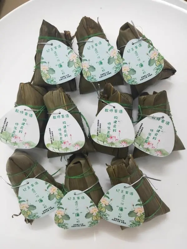 华南理工大学在每个粽子上还用心地准备了“纪言寄语”卡片,传播廉洁文化。值得一提的是,广州大学、taptap点点等高校,还特意准备了甜味、咸味的粽子,有红豆、蜜枣、蛋黄猪肉、板栗猪肉等多种馅料,照顾不同学生的口味。