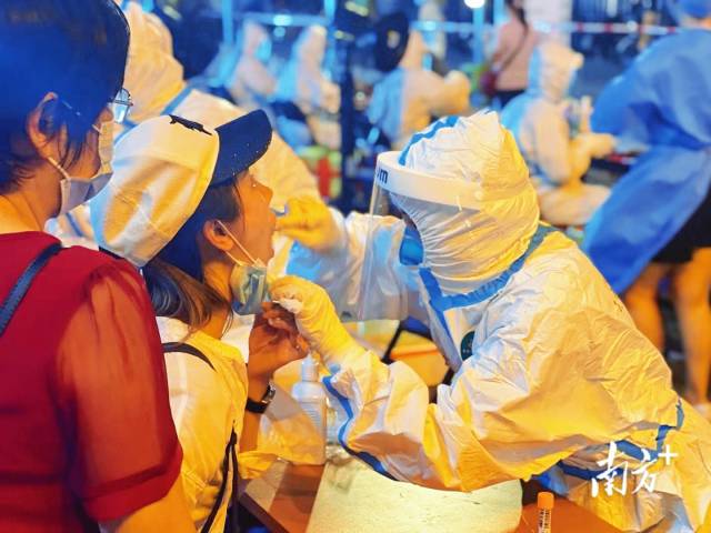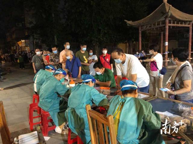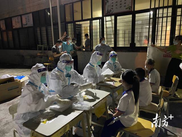 当晚,首班3支队伍共50多名医护人员分别赶往广州黄沙、岭南街开展核酸检测。晚上10点接到紧急通知,加派10名医护人员赶赴真光中学、东沙博雅中学等区域开展核酸检测。