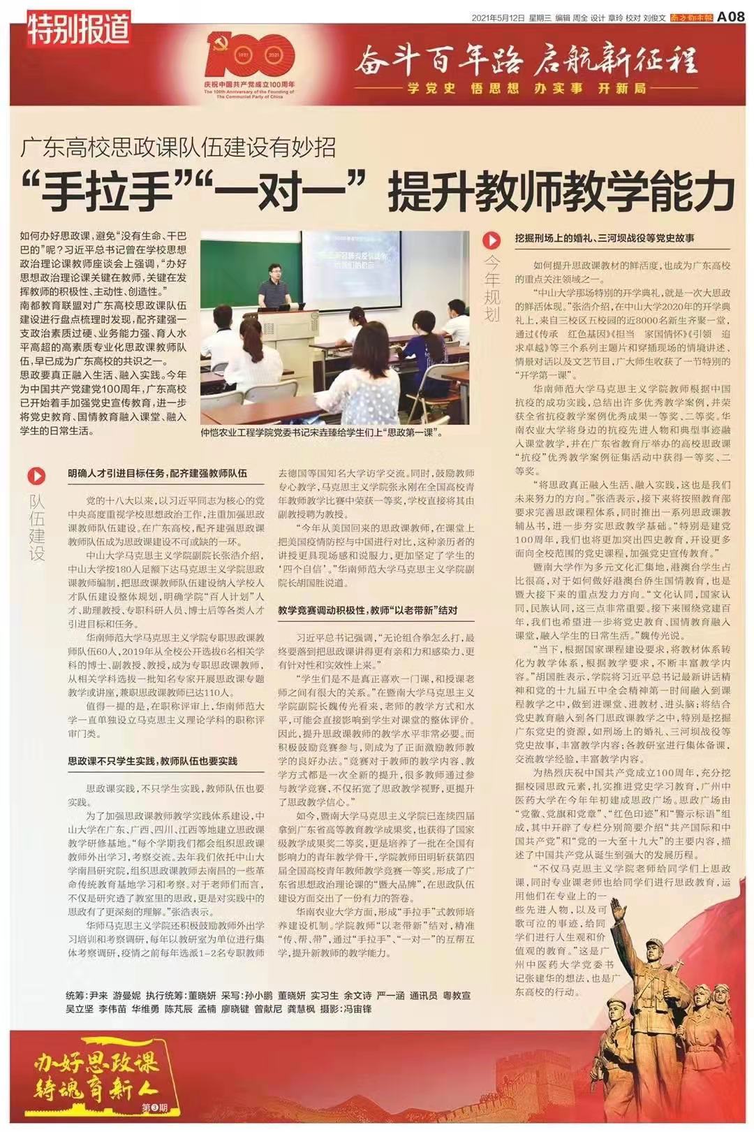 “当下,根据国家课程建设要求,将教材体系转化为教学体系,根据教学要求,不断丰富教学内容。”胡国胜表示,学院将习近平总书记最新讲话精神和党的十九届五中全会精神第一时间融入到课程教学之中,做到进课堂、进教材、进头脑;将结合党史教育融入到各门思政课教学之中,特别是挖掘广东党史的资源,如刑场上的婚礼、三河坝战役等党史故事,丰富教学内容;各教研室进行集体备课,交流教学经验,丰富教学内容。