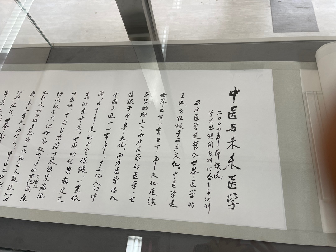 现场一幅长达十米的书法作品《中医与未来医学》吸引了诸多参观者。据了解,2004年,邓铁涛学术思想国际研讨会在广州举行,邓铁涛教授在开幕式上作了“中国与未来医学”的特别演讲,全面阐述了“未来医学”的系列理论观点,描绘了中医学发展的理想愿景。2016年,年过百岁的邓老欣然挥毫,以墨抒情,分多个时段,书写报告全文。