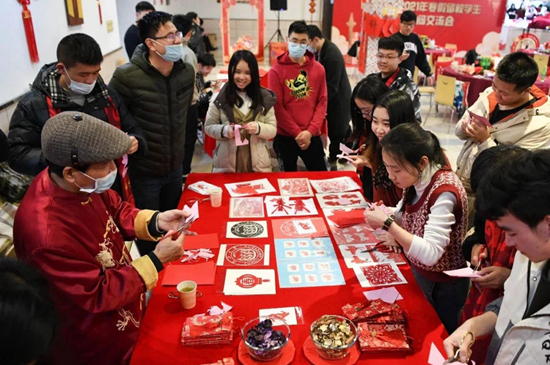 同济大学组织留校学生体验传统文化,图为师生一起剪年画。同济大学供图
