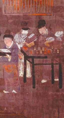 韩城盘乐村宋墓壁画上绘有一幅备药图,左侧男子手持《太平圣惠方》,右侧男子手持两个药包,上有“大黄”“白术”字样,似乎在等待左侧男子查阅书籍之后的指示。这幅图很生动的显示出《太平圣惠方》被当时的人们如何重视、喜爱。