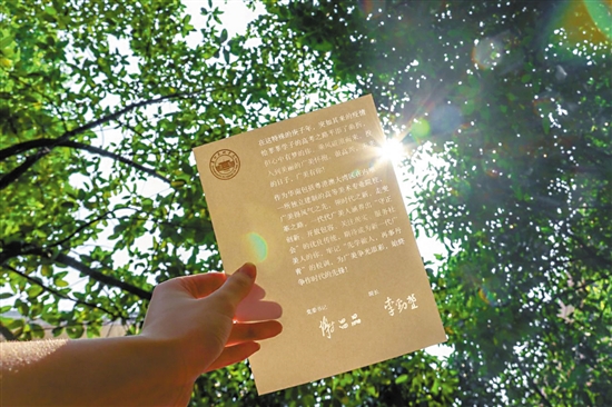 南京大学的录取通知书是典雅的四层紫色礼盒,不仅在每一层都配上一首表示激励和祝愿的古诗词,附有彝族图腾虎形胸章、甘蔗渣纸和云南特产金边玫瑰制造的纪念品,还准备了一场特殊的仪式“写给未来的自己”——新生在卡片的白色星火图案上可写下对未来自己说的话。