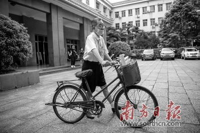 肖鑫和教授日常的交通工具是一辆45元买来的旧自行车,修修补补已经骑了25年。南方日报记者 徐昊 摄