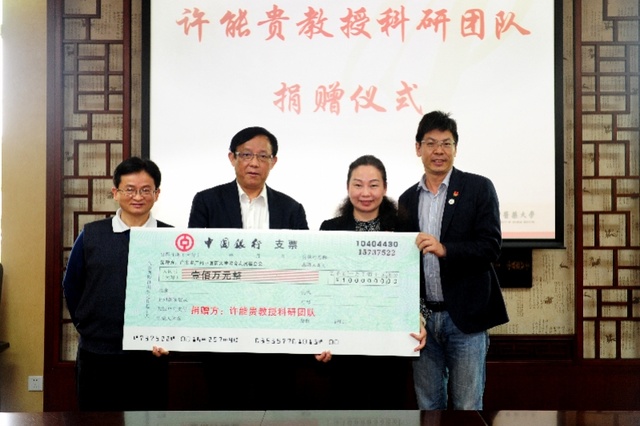 学校党委书记、学校教育发展基金会理事长张建华向团队代表颁发了捐赠证书。她高度赞赏了许能贵教授科研团队回馈学校的善举和对学校事业的支持。她指出,当前,学校新型冠状病毒肺炎疫情的防控工作有序推进,全校教职员工要以实际行动积极投入到疫情防控工作中,为“双一流”和高水平大学建设共同努力。