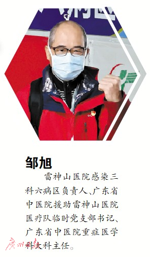 2月17日,广东省中医院和深圳市中医系统组建60人中医医疗队驰援武汉雷神山医院。邹旭当即请缨受命来到雷神山和这支队伍汇合,成为感染三科六病区(C6病区)负责人,带领他们开辟新病区,救治危重症患者。