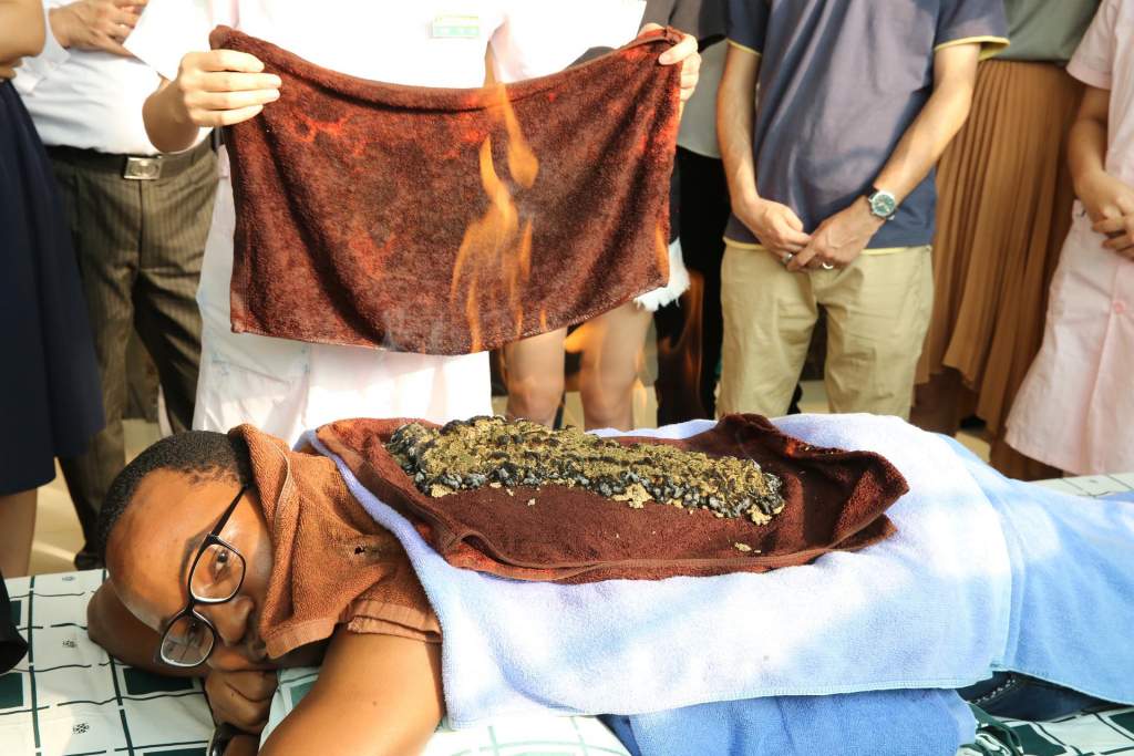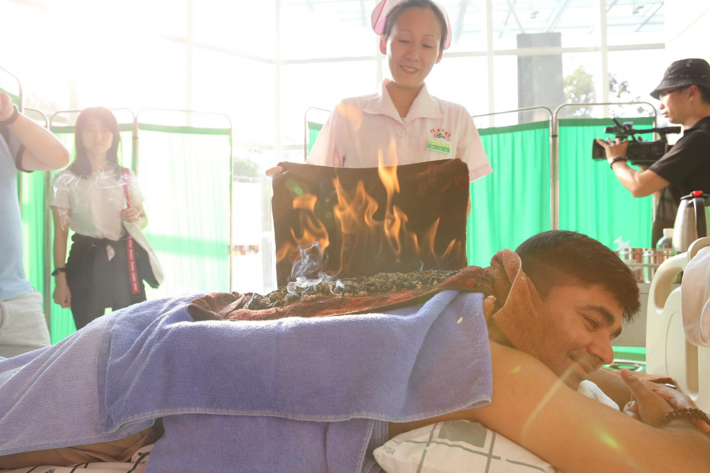在广东省中医院,体验了火龙灸和雷火灸魅力的留学生们,惊叹中医的博大精深。据介绍,火龙灸古称 " 灸焫 ",又称艾灸。以艾绒为主要材料,通过循经络点燃艾绒,直接或间接熏灼体表穴位的一种治疗方法。现代物理学研究表明,艾灸在燃烧时产生的辐射能谱是红外线,能有效激活经穴内的能量物质 ATP,使其沿经络线产生连锁反应,激发了经气,从而调动经脉的功能,使之更好的发挥行气血、阴阳的整体调节作用。临床一般 5~7 次。