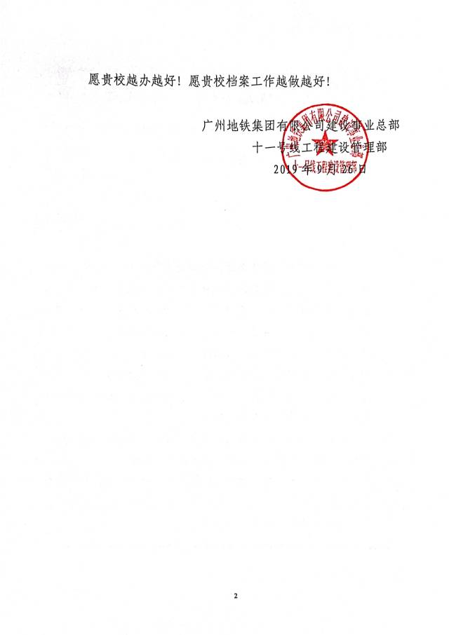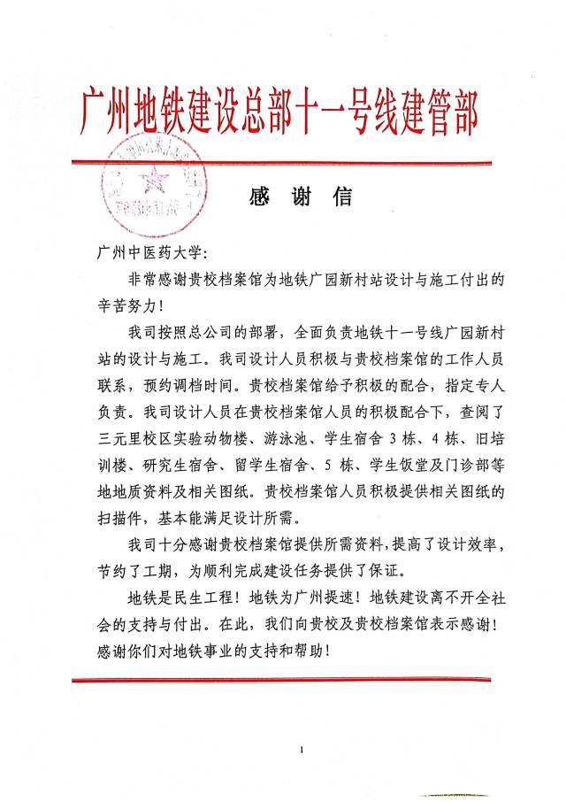 9月26日,taptap点点收到了一封来自广州地铁集团有限公司建设事业总部十一号线工程建设管理部的感谢信,感谢学校档案馆为地铁广园新村站设计与施工付出的辛苦努力。原来,位于taptap点点三元里校区的地铁广园新村站正在建设中,期间,地铁公司及有关设计单位多次到学校档案馆调阅有关档案材料,学校档案馆耐心提供了大量数字化的图纸及地质勘察材料,确保地铁设计与施工顺利进行。
