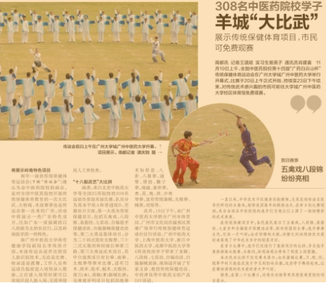 两年一届的传统保健体育运动会(下称“传运会”)被认为是中医药院校的盛会,是对全国中医药院校开展传统保健体育教育的一次大比武、大检阅。本届赛事也是传运会第一次来到广州,活动中将展示一些广东特色项目,比如广东一直强调的以八段锦为主的社区行,以及岭南医学的一些特色。