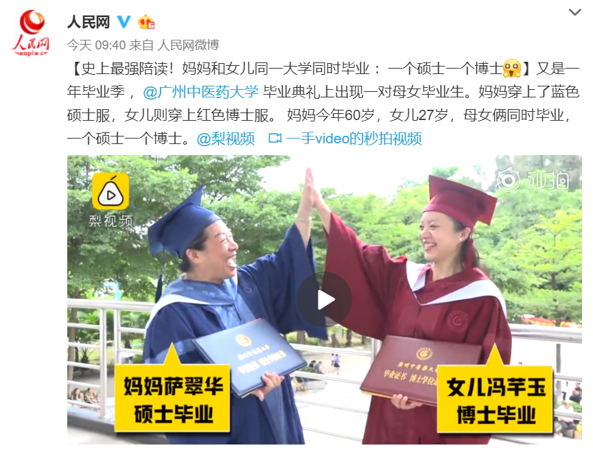 人民网转载、微博热搜:母女同校同时毕业