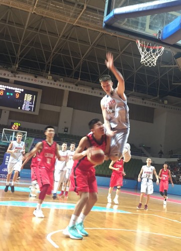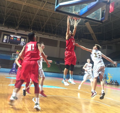 上图为在广东工业大学体育馆进行的男篮比赛
