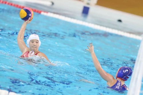 上图为在广东奥体游泳馆进行的女子水球比赛