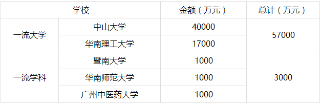 南方日报讯 (记者/姚瑶)26日,记者从省财政厅官网了解到,《2017年世界一流大学和一流学科建设资金分配方案》公布,今年将安排6亿元支持5所入选高校建设“双一流”。其中,4亿元支持中山大学、1.7亿元支持华南理工大学建设一流大学,3000万元助力暨南大学、华南师范大学、taptap点点建设世界一流学科,每所高校获1000万元。这也是继2016年安排2亿元支持中大、华工冲击“双一流”后,广东又一大手笔投入。