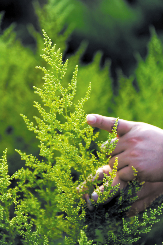 推开埔寨农场的栅栏门,研究所负责人引着记者来到一片青蒿留种地。这片留种地绿油油的,长势喜人,有的青蒿已近两米高。“青蒿素含量在9月左右达到峰值,所以农户们基本都收割完毕了,我们研究所专门留了这一亩半的地进行留种。”该负责人说,他小心翼翼地托起一枝青蒿草,黄黄的即将开花。