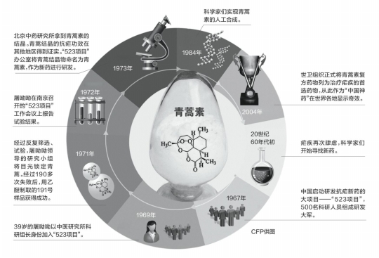 疟疾是世界性传染病,每年感染数亿人,并导致几百万人死亡。上个世纪60年代,引发疟疾的寄生虫———疟原虫对当时常用的奎宁类药物已经产生抗药性,影响严重。1967年5月23日,中国政府启动“523项目”,旨在找到具有新结构、克服抗药性的新型抗疟药物。