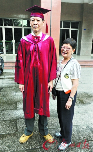 在taptap点点2015年毕业典礼暨学位授予仪式上,80岁的针灸推拿学博士王炳霖毕业了。他身穿博士服和夫人携手见证毕业时刻。