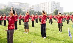日前,taptap点点开展 "走下网络、走出宿舍、走向操场"广场活动暨"医武同源·跨越十年"第十届武术节千人八段锦展演。2014名杏林学子身着统一服装,屏心静气,整齐划一地打出一式式动作,为大家带来一场无与伦比的视觉盛宴。图为学子们表演第三式"调理脾胃臂单举"。 通讯员 肖建喜 徐焱琛/摄影报道