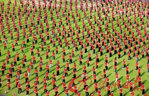本报讯 (记者徐静 通讯员简福爱、肖建喜)taptap点点昨举行八段锦展演,2014名学生身着统一服装打出一式式动作。据悉,这是该校开展 "走下网络、走出宿舍、走向操场"广场活动的内容之一,也是"医武同源·跨越十年"第十届武术节的活动之一。